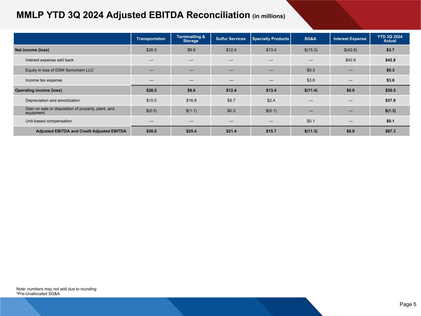MMLP YTD 3Q 2025 Adjusted EBITDA Reconciliation & Comparison (in millions) Page 4 Terminalling & Storage YTD 24A YTD 25A Smackover Refinery $10.9 $11.8 Specialty Terminals $8.9 $8.1 Shore-Based Terminals $4.5 $4.4 Underground Storage $1.0 $1.5 Total Terminalling & Storage $25.4 $25.8 Specialty Products YTD 24A YTD 25A Lubricants $6.2 $6.6 Grease $7.2 $3.6 Propane $1.7 $1.7 Natural Gasoline $0.7 $0.9 Total Specialty Products $15.7 $12.8 Adjusted EBITDA* $98.5 $85.6 Unallocated SG&A $(11.3) $(11.3) Total Adjusted EBITDA $87.3 $74.3 Sulfur Services YTD 24A YTD 25A Fertilizer $11.4 $13.8 ELSA $— $2.3 Sulfur $10.0 $9.1 Total Sulfur Services $21.4 $25.1 Transportation YTD 24A YTD 25A Land $23.7 $15.8 Marine $12.3 $6.0 Total Transportation $36.0 $21.8 Note: numbers may not add due to rounding *Pre-Unallocated SG&A Transportation Terminalling & Storage Sulfur Services Specialty Products SG&A Interest Expense YTD 3Q 2025 Actual Net income (loss) $14.5 $9.7 $13.9 $10.6 $(17.2) $(43.3) $(11.9) Interest expense add back — — — — — $43.3 $43.3 Equity in loss of DSM Semichem LLC — — — — $0.8 — $0.8 Income tax expense — — — — $3.9 — $3.9 Operating income (loss) $14.5 $9.7 $13.9 $10.6 $(12.5) $0.0 $36.2 Depreciation and amortization $8.8 $16.1 $10.6 $2.3 — — $37.8 Gain on sale or disposition of property, plant, and equipment $(1.5) — — — — — $(1.5) Transaction expenses related to the unsuccessful merger with Martin Resource Management Corporation — — — — $1.0 — $1.0 Non-cash contractual revenue deferral adjustment — — $0.6 — — — $0.6 Unit-based compensation — — — — $0.2 — $0.2 Adjusted EBITDA and Credit Adjusted EBITDA $21.8 $25.8 $25.1 $12.8 $(11.3) $0.0 $74.3