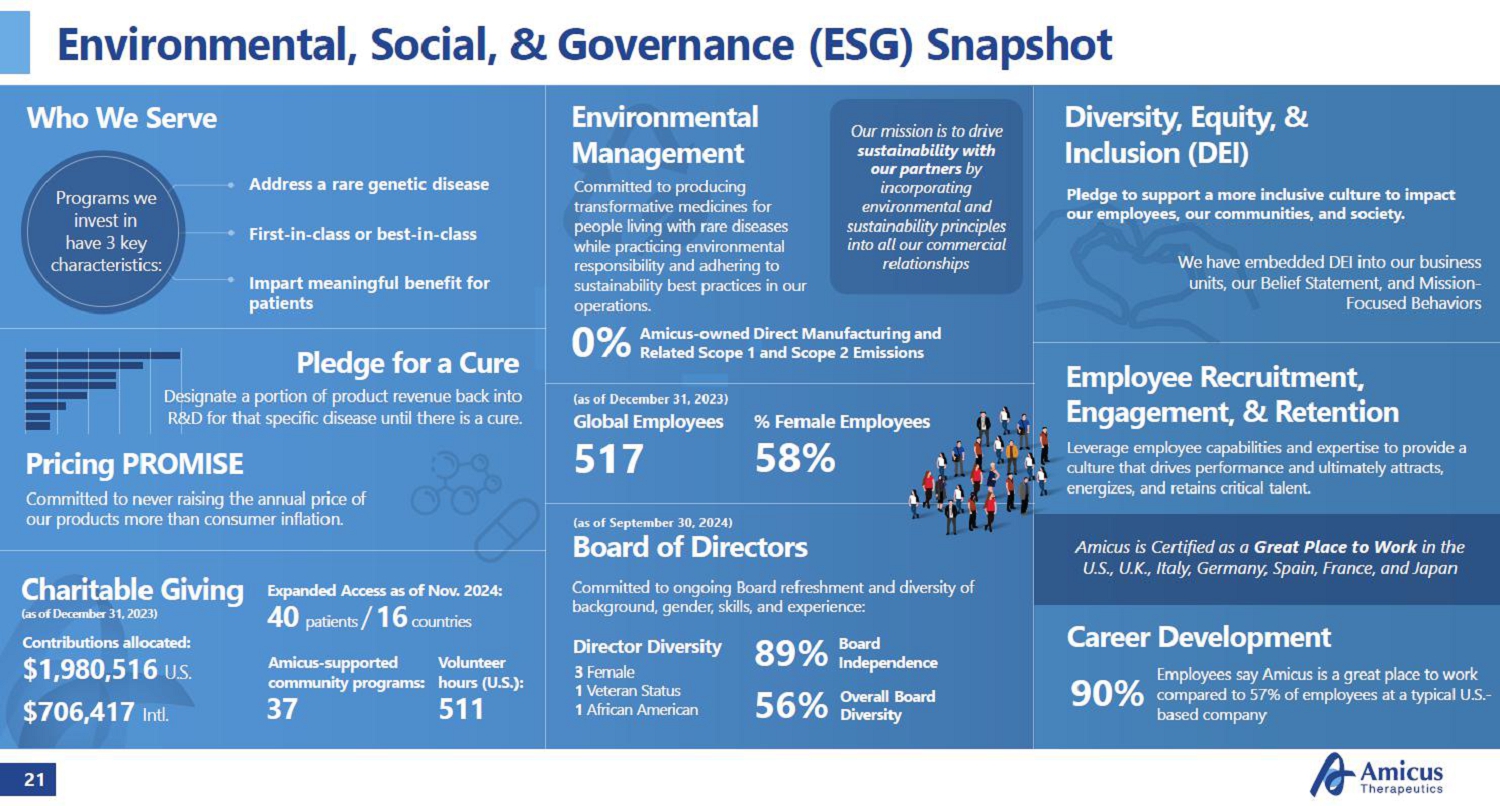 21 Environmental, Social, Governance (ESG) Snapshot Board of Directors Committed to ongoing Board refreshment and diversity of background, gender, skills, and experience: 89% Board Independence 56% Overall Board Diversity Address a rare genetic disease First-in-class or best-in-class Impart meaningful benefit for patients 517 Global Employees 58% % Female Employees Who We Serve Our mission is to drive sustainability with our partners by incorporating environmental and sustainability principles into all our commercial relationships Pledge for a Cure Designate a portion of product revenue back into RD for that specific disease until there is a cure. 3 Female 1 Veteran Status 1 African American Director Diversity Leverage employee capabilities and expertise to provide a culture that drives performance and ultimately attracts, energizes, and retains critical talent. Employee Recruitment, Engagement, Retention Amicus is Certified as a Great Place to Work in the U.S., U.K., Italy, Germany, Spain, France, and Japan Career Development Employees say Amicus is a great place to work compared to 57% of employees at a typical U.S.- based company Committed to producing transformative medicines for people living with rare diseases while practicing environmental responsibility and adhering to sustainability best practices in our operations. Environmental Management 0% Amicus-owned Direct Manufacturing and Related Scope 1 and Scope 2 Emissions Diversity, Equity, Inclusion (DEI) 511 Volunteer hours (U.S.): 37 Amicus-supported community programs: 40 patients / 16 countries Expanded Access as of Nov. 2024: Pricing PROMISE Contributions allocated: $1,980,516 U.S. $706,417 Intl. Charitable Giving (as of December 31, 2023) Committed to never raising the annual price of our products more than consumer inflation. Pledge to support a more inclusive culture to impact our employees, our communities, and society. We have embedded DEI into our business units, our Belief Statement, and Mission- Focused Behaviors 90% Programs we invest in have 3 key characteristics: (as of December 31, 2023) (as of September 30, 2024)