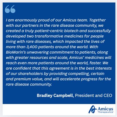 Amicus Therapeutics has entered into a definitive agreement to be acquired by BioMarin Pharmaceutical for $14.50 per share in cash, reflecting a total equity value of approximately $4.8 billion.
