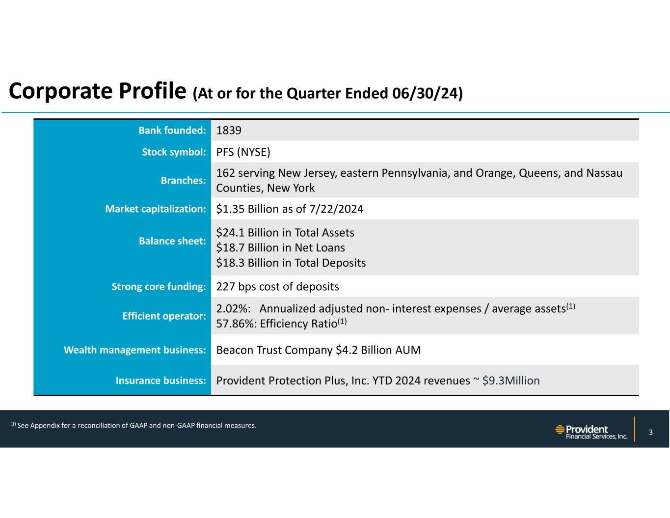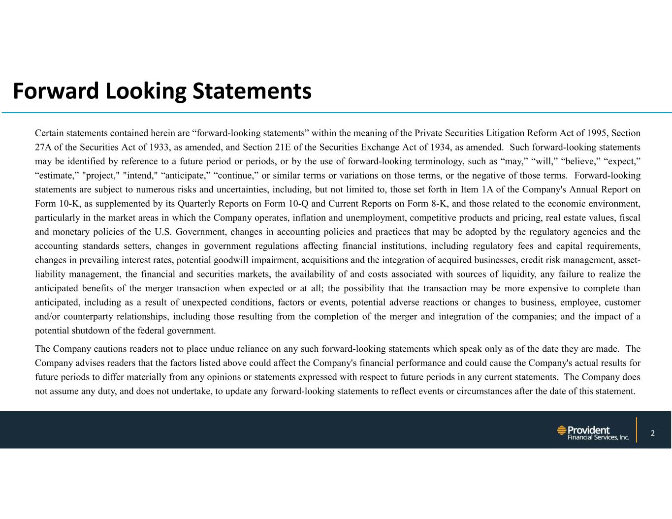 NYSE: PFS Forward Looking Statements Certain statements contained herein are “forward-looking statements” within the meaning of the Private Securities Litigation Reform Act of 1995, Section 27A of the Securities Act of 1933, as amended, and Section 21E of the Securities Exchange Act of 1934, as amended. Such forward-looking statements may be identified by reference to a future period or periods, or by the use of forward-looking terminology, such as “may,” “will,” “believe,” “expect,” “estimate,” "project," "intend," “anticipate,” “continue,” or similar terms or variations on those terms, or the negative of those terms. Forward-looking statements are subject to numerous risks and uncertainties, including, but not limited to, those set forth in Item 1A of the Company's Annual Report on Form 10-K, as supplemented by its Quarterly Reports on Form 10-Q and Current Reports on Form 8-K, and those related to the economic environment, particularly in the market areas in which the Company operates, inflation and unemployment, competitive products and pricing, real estate values, fiscal and monetary policies of the U.S. Government, changes in accounting policies and practices that may be adopted by the regulatory agencies and the accounting standards setters, changes in government regulations affecting financial institutions, including regulatory fees and capital requirements, changes in prevailing interest rates, potential goodwill impairment, acquisitions and the integration of acquired businesses, credit risk management, asset- liability management, the financial and securities markets, the availability of and costs associated with sources of liquidity, any failure to realize the anticipated benefits of the merger transaction when expected or at all; the possibility that the transaction may be more expensive to complete than anticipated, including as a result of unexpected conditions, factors or events, potential adverse reactions or changes to business, employee, customer and/or counterparty relationships, including those resulting from the completion of the merger and integration of the companies; and the impact of a potential shutdown of the federal government. The Company cautions readers not to place undue reliance on any such forward-looking statements which speak only as of the date they are made. The Company advises readers that the factors listed above could affect the Company's financial performance and could cause the Company's actual results for future periods to differ materially from any opinions or statements expressed with respect to future periods in any current statements. The Company does not assume any duty, and does not undertake, to update any forward-looking statements to reflect events or circumstances after the date of this statement. 2