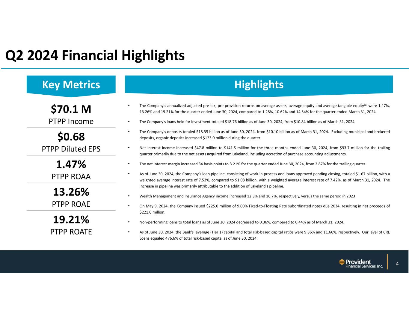 NYSE: PFS Corporate Profile (At or for the Quarter Ended 06/30/24) 3 1839Bank founded: PFS (NYSE)Stock symbol: 162 serving New Jersey, eastern Pennsylvania, and Orange, Queens, and Nassau Counties, New York Branches: $1.35 Billion as of 7/22/2024Market capitalization: $24.1 Billion in Total Assets $18.7 Billion in Net Loans $18.3 Billion in Total Deposits Balance sheet: 227 bps cost of deposits Strong core funding: 2.02%: Annualized adjusted non- interest expenses / average assets(1) 57.86%: Efficiency Ratio(1)Efficient operator: Beacon Trust Company $4.2 Billion AUMWealth management business: Provident Protection Plus, Inc. YTD 2024 revenues ~ $9.3MillionInsurance business: (1) See Appendix for a reconciliation of GAAP and non-GAAP financial measures.