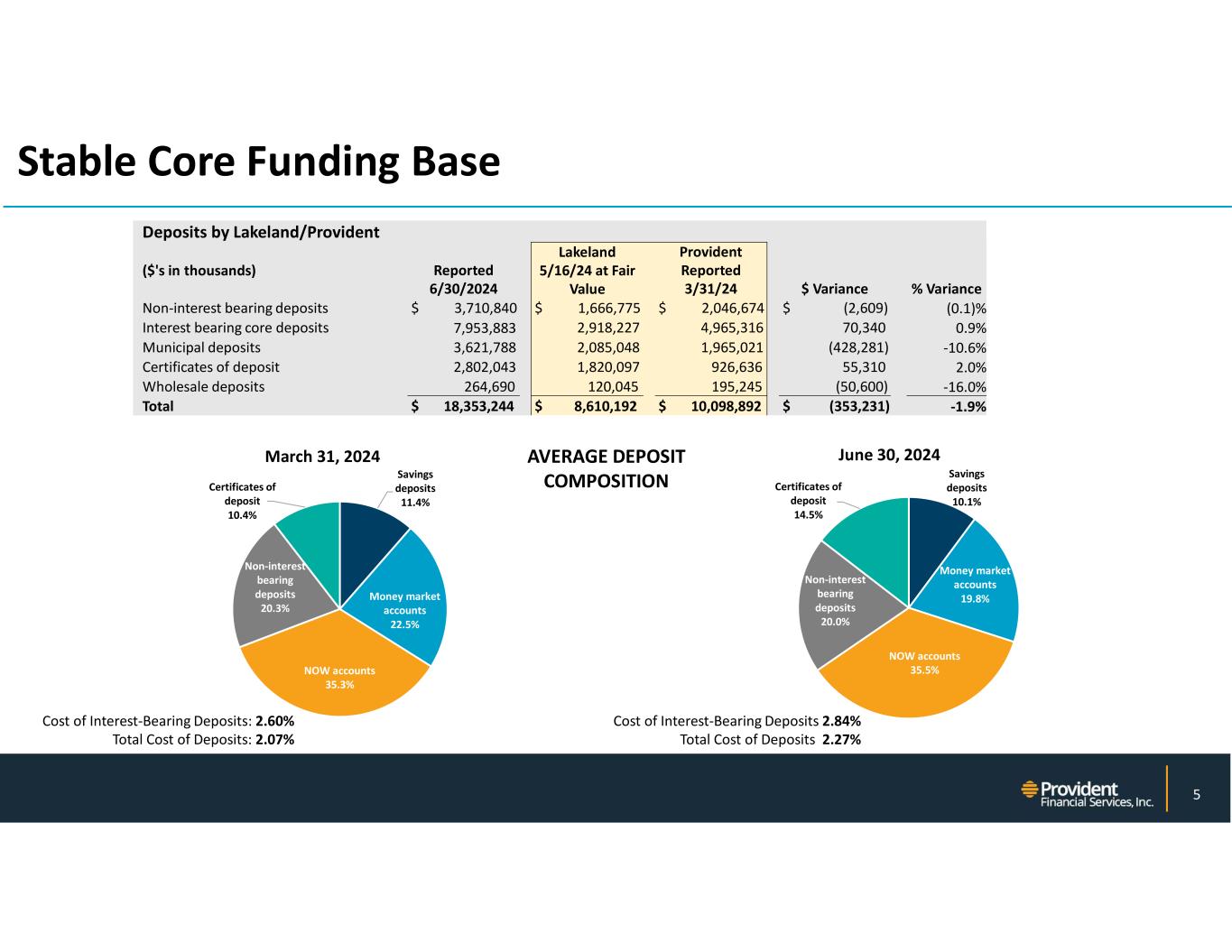 NYSE: PFS 4 Q2 2024 Financial Highlights $70.1 M PTPP Income $0.68 PTPP Diluted EPS 1.47% PTPP ROAA 13.26% PTPP ROAE 19.21% PTPP ROATE Key Metrics Highlights • The Company's annualized adjusted pre-tax, pre-provision returns on average assets, average equity and average tangible equity(1) were 1.47%, 13.26% and 19.21% for the quarter ended June 30, 2024, compared to 1.28%, 10.62% and 14.54% for the quarter ended March 31, 2024. • The Company’s loans held for investment totaled $18.76 billion as of June 30, 2024, from $10.84 billion as of March 31, 2024 • The Company's deposits totaled $18.35 billion as of June 30, 2024, from $10.10 billion as of March 31, 2024. Excluding municipal and brokered deposits, organic deposits increased $123.0 million during the quarter. • Net interest income increased $47.8 million to $141.5 million for the three months ended June 30, 2024, from $93.7 million for the trailing quarter primarily due to the net assets acquired from Lakeland, including accretion of purchase accounting adjustments. • The net interest margin increased 34 basis points to 3.21% for the quarter ended June 30, 2024, from 2.87% for the trailing quarter. • As of June 30, 2024, the Company's loan pipeline, consisting of work-in-process and loans approved pending closing, totaled $1.67 billion, with a weighted average interest rate of 7.53%, compared to $1.08 billion, with a weighted average interest rate of 7.42%, as of March 31, 2024. The increase in pipeline was primarily attributable to the addition of Lakeland's pipeline. • Wealth Management and Insurance Agency income increased 12.3% and 16.7%, respectively, versus the same period in 2023 • On May 9, 2024, the Company issued $225.0 million of 9.00% Fixed-to-Floating Rate subordinated notes due 2034, resulting in net proceeds of $221.0 million. • Non-performing loans to total loans as of June 30, 2024 decreased to 0.36%, compared to 0.44% as of March 31, 2024. • As of June 30, 2024, the Bank's leverage (Tier 1) capital and total risk-based capital ratios were 9.36% and 11.66%, respectively. Our level of CRE Loans equaled 476.6% of total risk-based capital as of June 30, 2024.