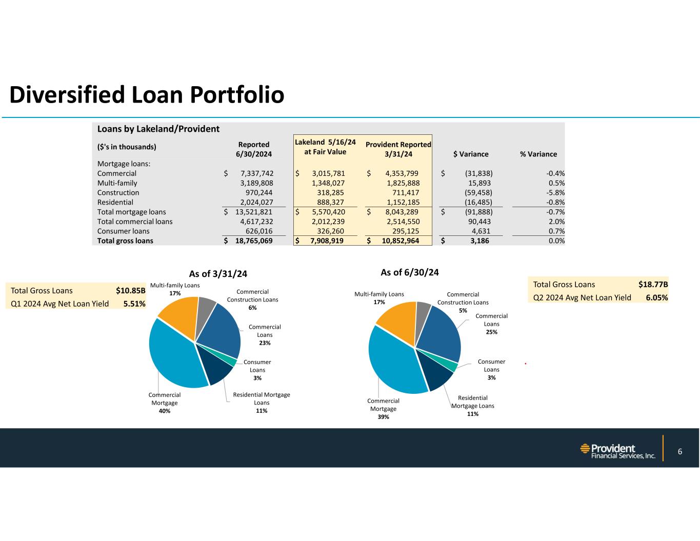 NYSE: PFS Savings deposits 11.4% Money market accounts 22.5% NOW accounts 35.3% Non-interest bearing deposits 20.3% Certificates of deposit 10.4% Stable Core Funding Base Cost of Interest-Bearing Deposits: 2.60% Total Cost of Deposits: 2.07% AVERAGE DEPOSIT COMPOSITION 5 Savings deposits 10.1% Money market accounts 19.8% NOW accounts 35.5% Non-interest bearing deposits 20.0% Certificates of deposit 14.5% March 31, 2024 June 30, 2024 Cost of Interest-Bearing Deposits 2.84% Total Cost of Deposits 2.27% Deposits by Lakeland/Provident % Variance$ Variance Provident Reported 3/31/24 Lakeland 5/16/24 at Fair Value Reported 6/30/2024 ($'s in thousands) (0.1)%$ (2,609)$ 2,046,674 $ 1,666,775 $ 3,710,840Non-interest bearing deposits 0.9%70,3404,965,316 2,918,227 7,953,883Interest bearing core deposits -10.6%(428,281)1,965,021 2,085,048 3,621,788 Municipal deposits 2.0%55,310926,636 1,820,097 2,802,043Certificates of deposit -16.0%(50,600)195,245 120,045 264,690Wholesale deposits -1.9%$ (353,231)$ 10,098,892 $ 8,610,192 $ 18,353,244 Total