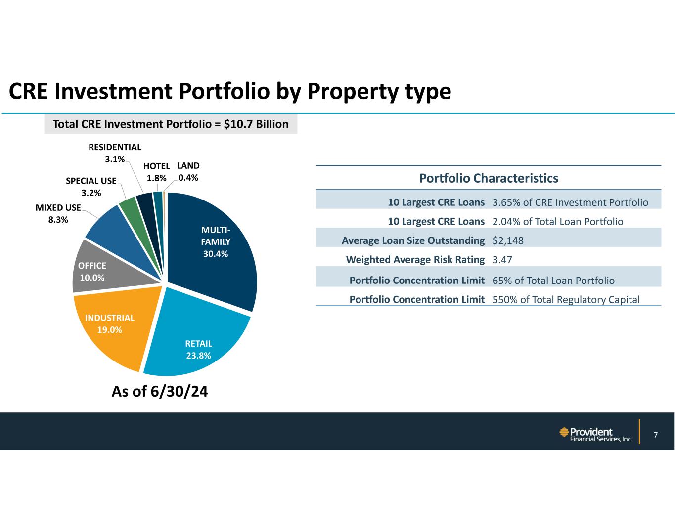 NYSE: PFS Diversified Loan Portfolio As of 6/30/24 6 $18.77BTotal Gross Loans 6.05%Q2 2024 Avg Net Loan Yield Residential Mortgage Loans 11% Commercial Mortgage 39% Multi-family Loans 17% Commercial Construction Loans 5% Commercial Loans 25% Consumer Loans 3% Residential Mortgage Loans 11% Commercial Mortgage 40% Multi-family Loans 17% Commercial Construction Loans 6% Commercial Loans 23% Consumer Loans 3% As of 3/31/24 $10.85BTotal Gross Loans 5.51%Q1 2024 Avg Net Loan Yield Loans by Lakeland/Provident % Variance$ Variance Provident Reported 3/31/24 Lakeland 5/16/24 at Fair Value Reported 6/30/2024 ($'s in thousands) Mortgage loans: -0.4%$ (31,838)$ 4,353,799 $ 3,015,781 $ 7,337,742 Commercial 0.5%15,893 1,825,888 1,348,027 3,189,808 Multi-family -5.8%(59,458)711,417 318,285 970,244 Construction -0.8%(16,485)1,152,185 888,327 2,024,027 Residential -0.7%$ (91,888)$ 8,043,289 $ 5,570,420 $ 13,521,821 Total mortgage loans 2.0%90,443 2,514,550 2,012,239 4,617,232 Total commercial loans 0.7%4,631 295,125 326,260 626,016 Consumer loans 0.0%$ 3,186 $ 10,852,964 $ 7,908,919 $ 18,765,069 Total gross loans