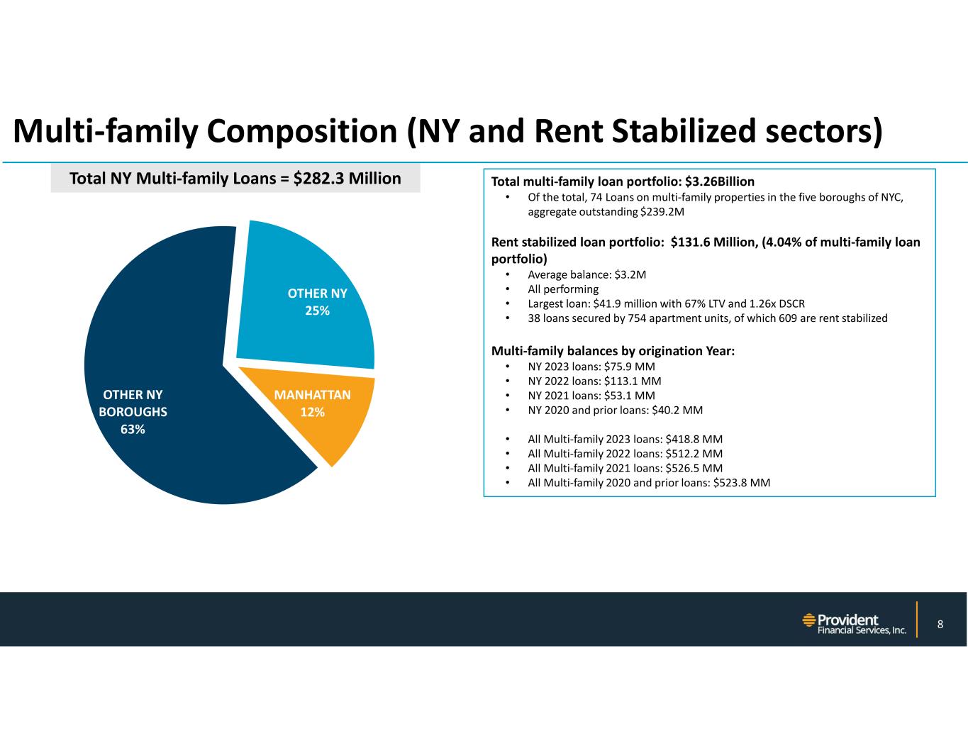 NYSE: PFS CRE Investment Portfolio by Property type 7 As of 6/30/24 MULTI- FAMILY 30.4% RETAIL 23.8% INDUSTRIAL 19.0% OFFICE 10.0% MIXED USE 8.3% SPECIAL USE 3.2% RESIDENTIAL 3.1% HOTEL 1.8% LAND 0.4% Portfolio Characteristics 3.65% of CRE Investment Portfolio10 Largest CRE Loans 2.04% of Total Loan Portfolio10 Largest CRE Loans $2,148Average Loan Size Outstanding 3.47Weighted Average Risk Rating 65% of Total Loan PortfolioPortfolio Concentration Limit 550% of Total Regulatory CapitalPortfolio Concentration Limit Total CRE Investment Portfolio = $10.7 Billion