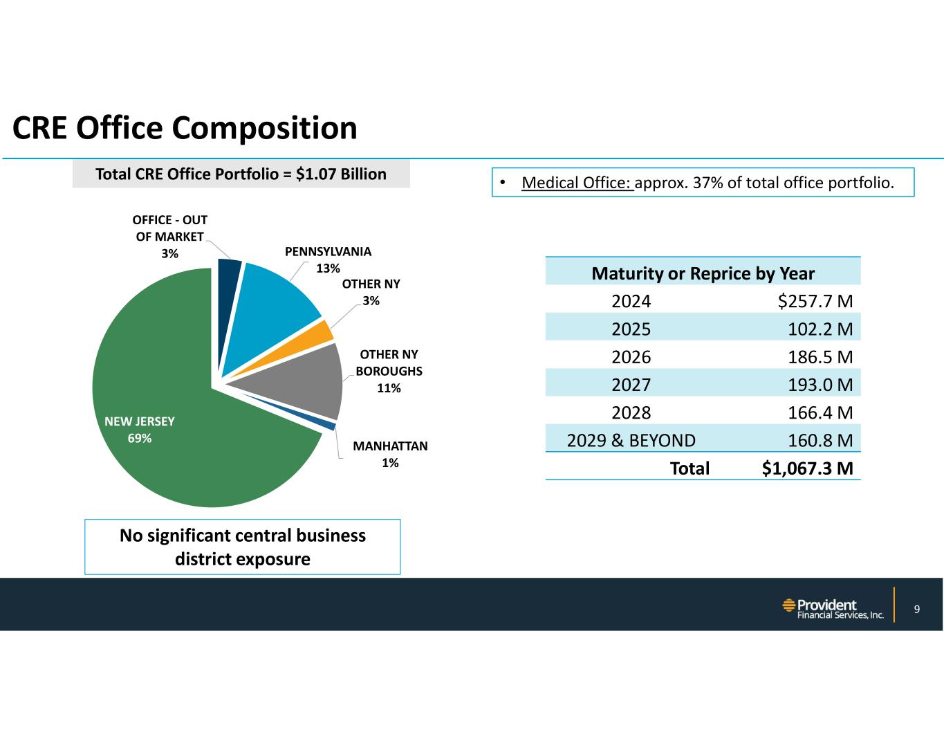 NYSE: PFS Multi-family Composition (NY and Rent Stabilized sectors) 8 OTHER NY BOROUGHS 63% OTHER NY 25% MANHATTAN 12% Total NY Multi-family Loans = $282.3 Million Total multi-family loan portfolio: $3.26Billion • Of the total, 74 Loans on multi-family properties in the five boroughs of NYC, aggregate outstanding $239.2M Rent stabilized loan portfolio: $131.6 Million, (4.04% of multi-family loan portfolio) • Average balance: $3.2M • All performing • Largest loan: $41.9 million with 67% LTV and 1.26x DSCR • 38 loans secured by 754 apartment units, of which 609 are rent stabilized Multi-family balances by origination Year: • NY 2023 loans: $75.9 MM • NY 2022 loans: $113.1 MM • NY 2021 loans: $53.1 MM • NY 2020 and prior loans: $40.2 MM • All Multi-family 2023 loans: $418.8 MM • All Multi-family 2022 loans: $512.2 MM • All Multi-family 2021 loans: $526.5 MM • All Multi-family 2020 and prior loans: $523.8 MM