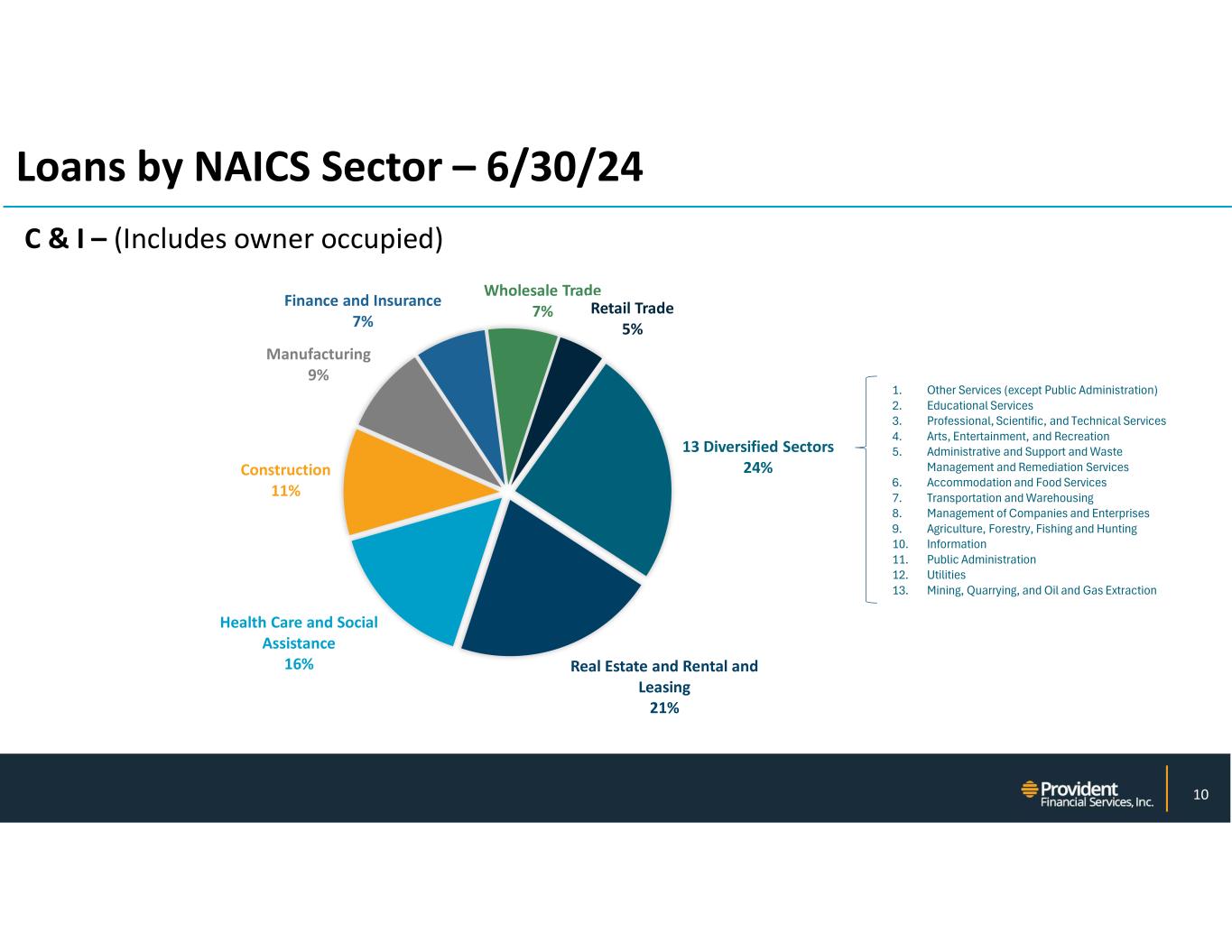 NYSE: PFS CRE Office Composition 9 • Medical Office: approx. 37% of total office portfolio. Maturity or Reprice by Year $257.7 M2024 102.2 M2025 186.5 M2026 193.0 M2027 166.4 M2028 160.8 M2029 & BEYOND $1,067.3 MTotal OFFICE - OUT OF MARKET 3% PENNSYLVANIA 13% OTHER NY 3% OTHER NY BOROUGHS 11% MANHATTAN 1% NEW JERSEY 69% No significant central business district exposure Total CRE Office Portfolio = $1.07 Billion