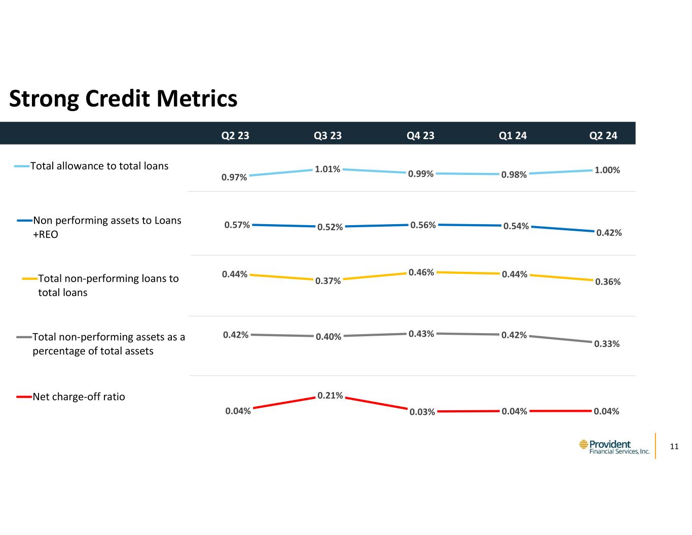 Strong Credit Metrics 11 0.97% 1.01% 0.99% 0.98% 1.00%Total allowance to total loans 0.57% 0.52% 0.56% 0.54% 0.42% Non performing assets to Loans +REO 0.44% 0.37% 0.46% 0.44% 0.36%Total non-performing loans to total loans 0.42% 0.40% 0.43% 0.42% 0.33% Total non-performing assets as a percentage of total assets 0.04% 0.21% 0.03% 0.04% 0.04% Net charge-off ratio Q2 23 Q1 24 Q2 24Q3 23 Q4 23