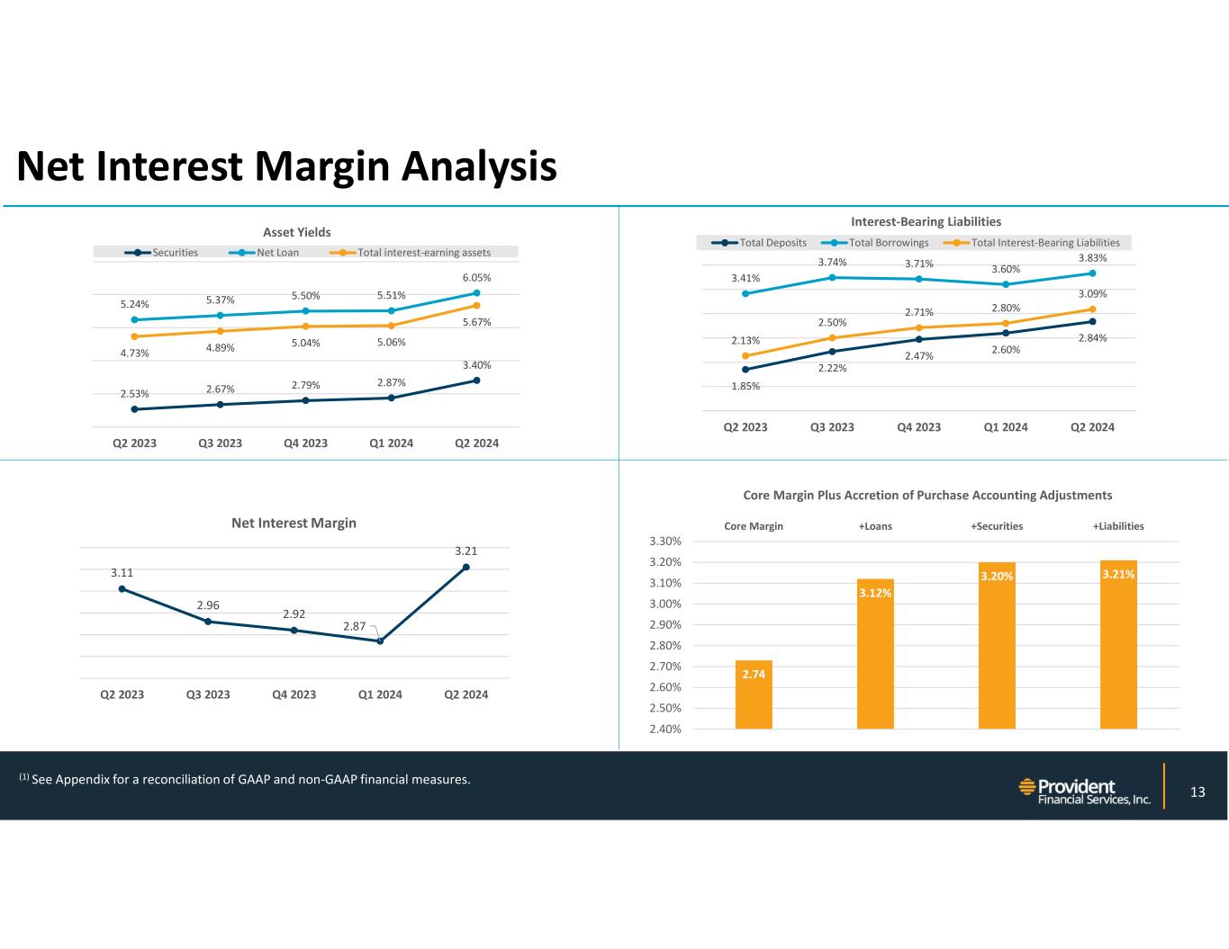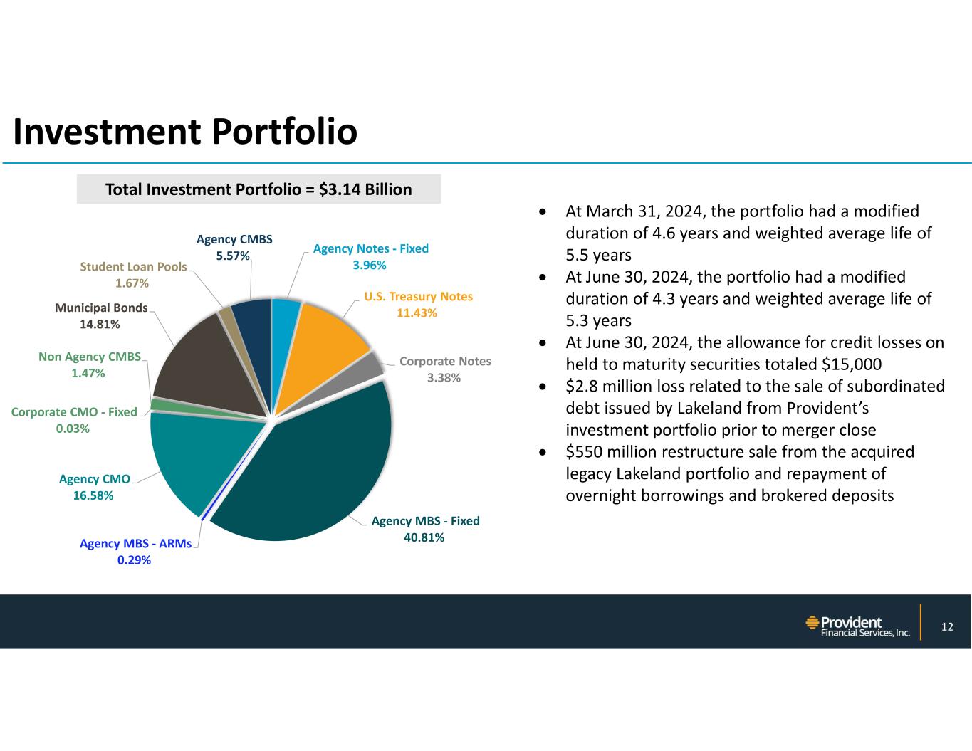 NYSE: PFS Agency Notes - Fixed 3.96% U.S. Treasury Notes 11.43% Corporate Notes 3.38% Agency MBS - Fixed 40.81%Agency MBS - ARMs 0.29% Agency CMO 16.58% Corporate CMO - Fixed 0.03% Non Agency CMBS 1.47% Municipal Bonds 14.81% Student Loan Pools 1.67% Agency CMBS 5.57% Investment Portfolio 12 Total Investment Portfolio = $3.14 Billion  At March 31, 2024, the portfolio had a modified duration of 4.6 years and weighted average life of 5.5 years  At June 30, 2024, the portfolio had a modified duration of 4.3 years and weighted average life of 5.3 years  At June 30, 2024, the allowance for credit losses on held to maturity securities totaled $15,000  $2.8 million loss related to the sale of subordinated debt issued by Lakeland from Provident’s investment portfolio prior to merger close  $550 million restructure sale from the acquired legacy Lakeland portfolio and repayment of overnight borrowings and brokered deposits