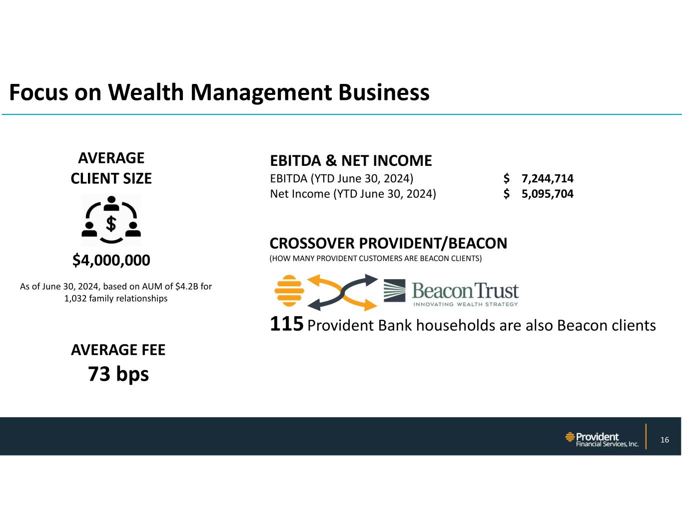 NYSE: PFS * Represents interest on lines of credit to Beacon clients, whose investment accounts are pledged as collateral. Advisory 86% Trust & Estate 8% Tax 3% Private Banking 3% Focus on Wealth Management Business 15 $4.2 Billion AUM For 1,032 family relationships 2024 YTD Revenue $ 13,593,512 Advisory $ 1,213,933 Trust & Estate *$ 449,780 Tax $ 547,828 Interest Income $ 15,805,053 Total