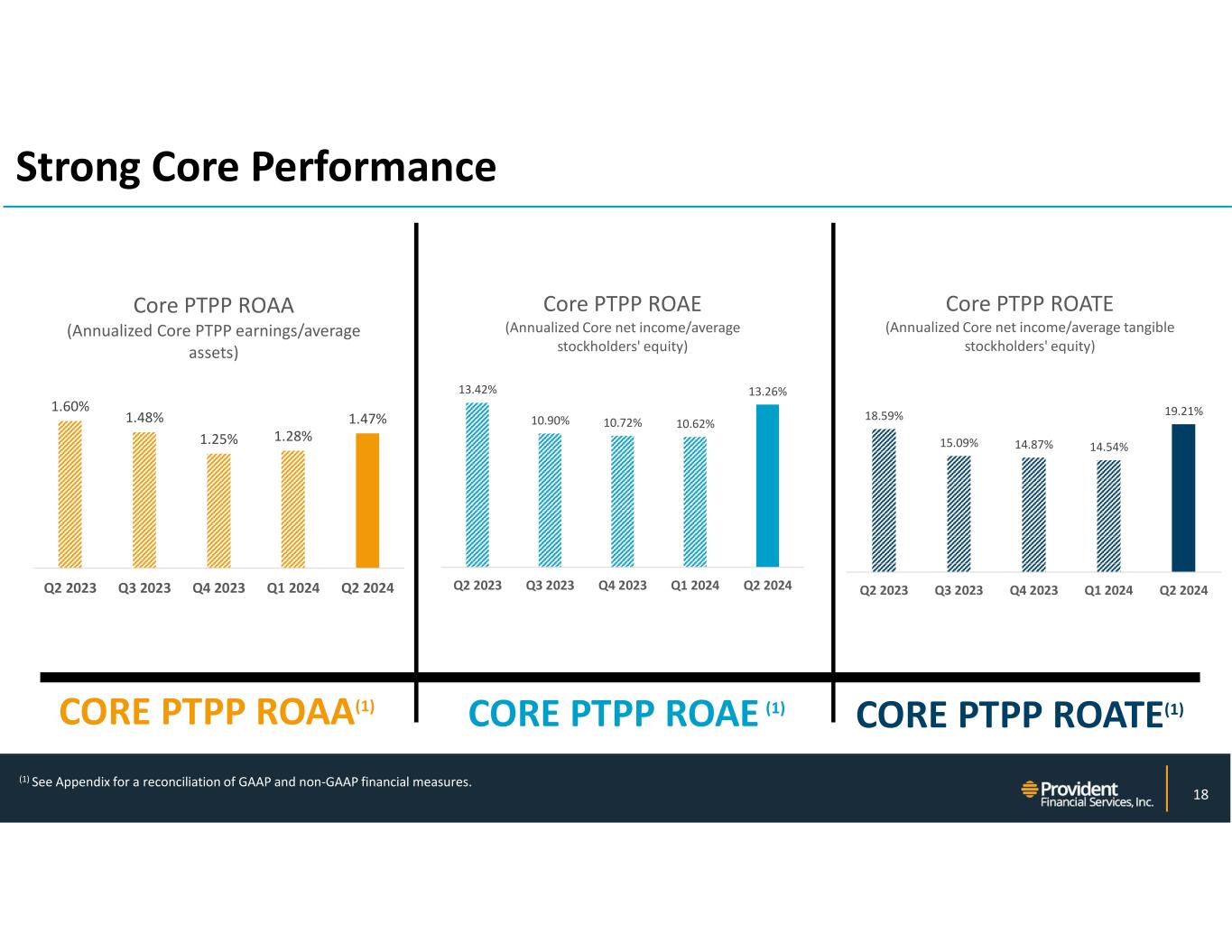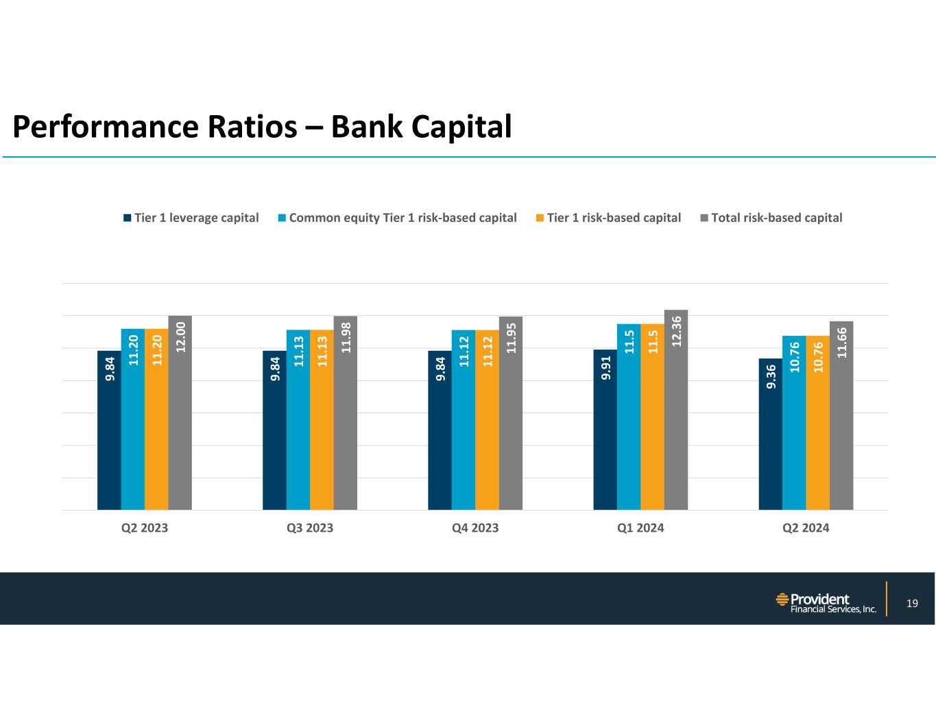 NYSE: PFS 1.60% 1.48% 1.25% 1.28% 1.47% Q2 2023 Q3 2023 Q4 2023 Q1 2024 Q2 2024 Core PTPP ROAA (Annualized Core PTPP earnings/average assets) CORE PTPP ROAA(1) (1) See Appendix for a reconciliation of GAAP and non-GAAP financial measures. Strong Core Performance 18 18.59% 15.09% 14.87% 14.54% 19.21% Q2 2023 Q3 2023 Q4 2023 Q1 2024 Q2 2024 Core PTPP ROATE (Annualized Core net income/average tangible stockholders' equity) CORE PTPP ROATE(1) 13.42% 10.90% 10.72% 10.62% 13.26% Q2 2023 Q3 2023 Q4 2023 Q1 2024 Q2 2024 Core PTPP ROAE (Annualized Core net income/average stockholders' equity) CORE PTPP ROAE (1)