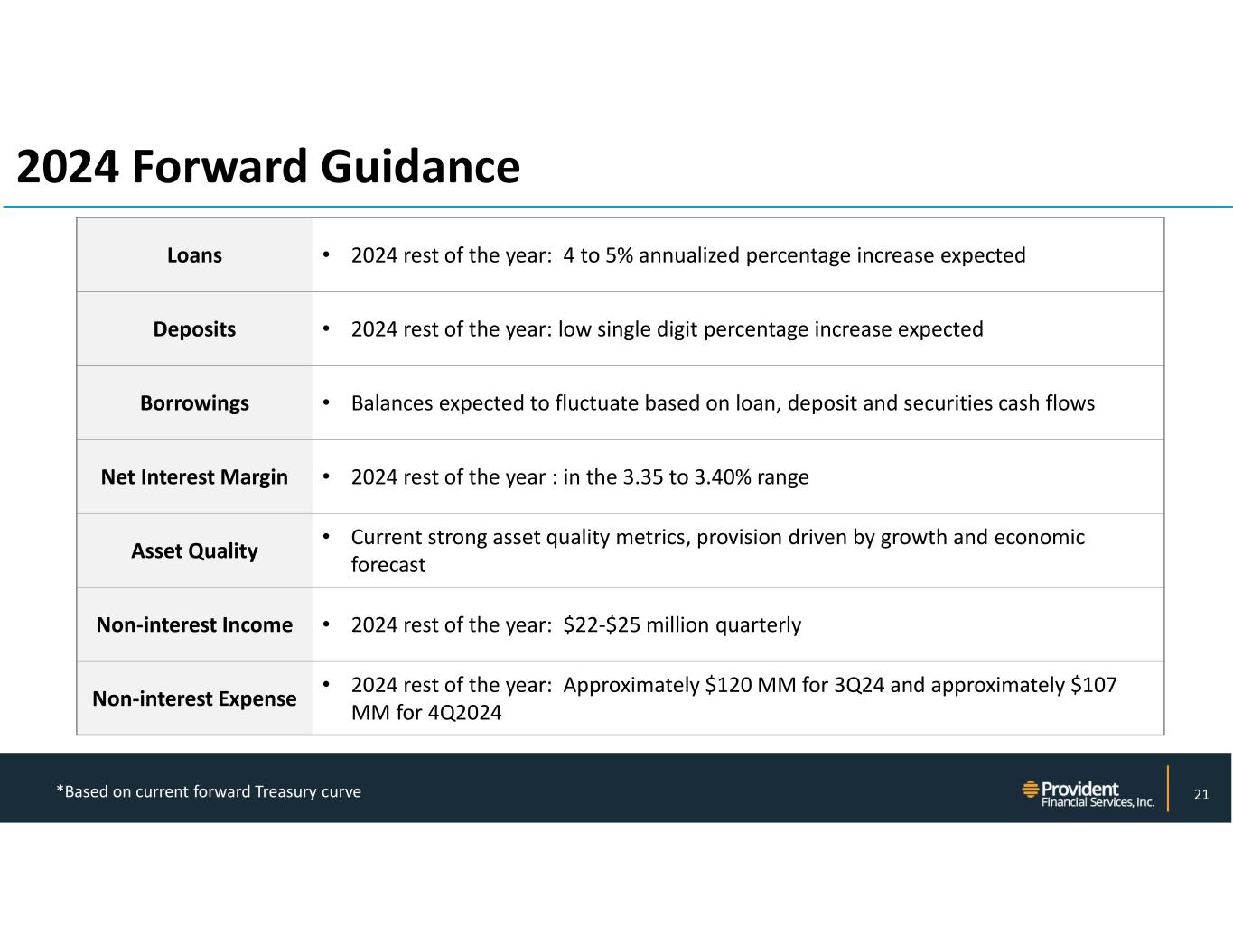 NYSE: PFS 2024 Forward Guidance 21 • 2024 rest of the year: 4 to 5% annualized percentage increase expectedLoans • 2024 rest of the year: low single digit percentage increase expectedDeposits • Balances expected to fluctuate based on loan, deposit and securities cash flowsBorrowings • 2024 rest of the year : in the 3.35 to 3.40% rangeNet Interest Margin • Current strong asset quality metrics, provision driven by growth and economic forecastAsset Quality • 2024 rest of the year: $22-$25 million quarterlyNon-interest Income • 2024 rest of the year: Approximately $120 MM for 3Q24 and approximately $107 MM for 4Q2024Non-interest Expense *Based on current forward Treasury curve