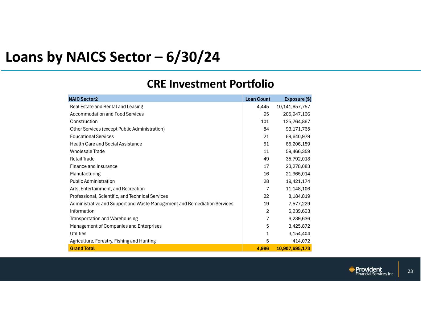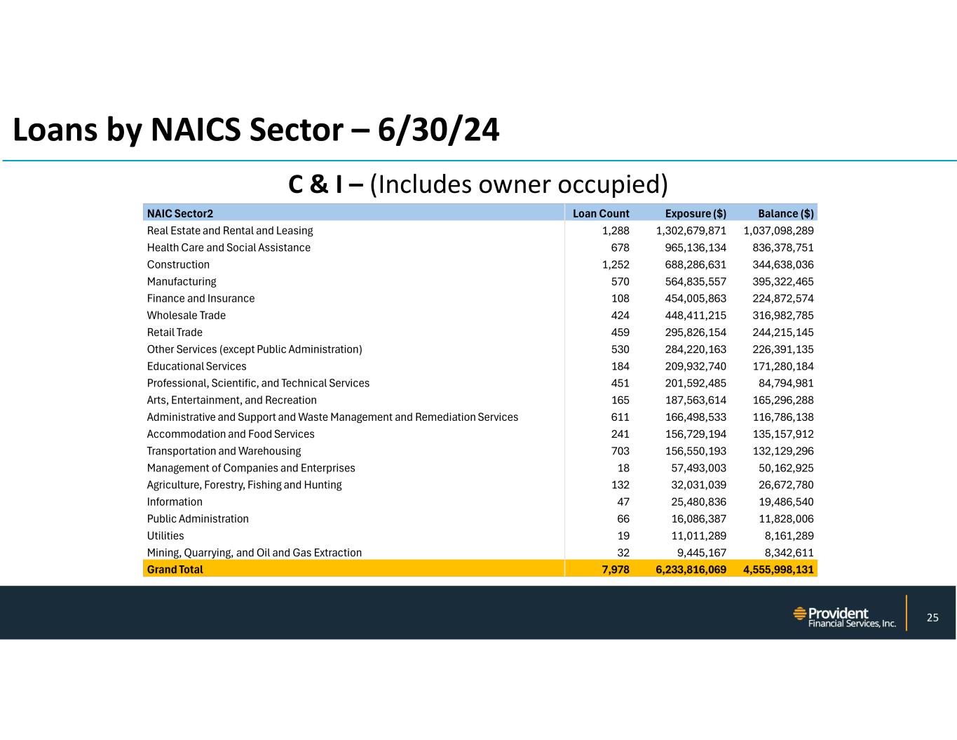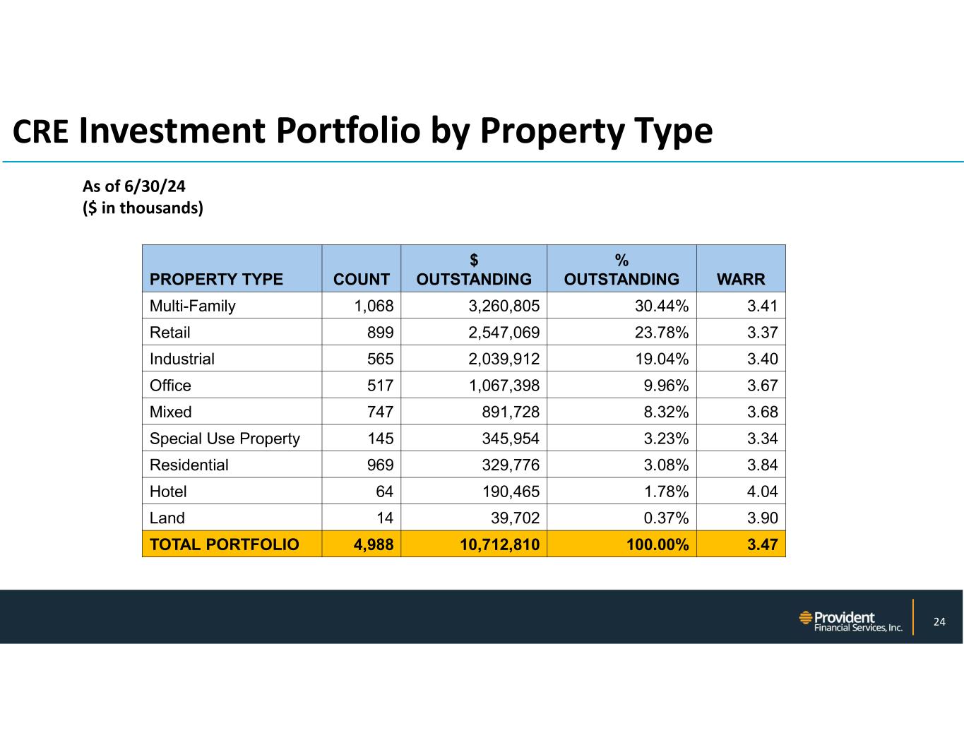NYSE: PFS CRE Investment Portfolio Loans by NAICS Sector – 6/30/24 23 Exposure ($)Loan CountNAIC Sector2 10,141,657,7574,445Real Estate and Rental and Leasing 205,947,16695Accommodation and Food Services 125,764,867101Construction 93,171,76584Other Services (except Public Administration) 69,640,97921Educational Services 65,206,15951Health Care and Social Assistance 59,466,35911Wholesale Trade 35,792,01849Retail Trade 23,278,08317Finance and Insurance 21,965,01416Manufacturing 19,421,17428Public Administration 11,148,1067Arts, Entertainment, and Recreation 8,184,81922Professional, Scientific, and Technical Services 7,577,22919Administrative and Support and Waste Management and Remediation Services 6,239,6932Information 6,239,6367Transportation and Warehousing 3,425,8725Management of Companies and Enterprises 3,154,4041Utilities 414,0725Agriculture, Forestry, Fishing and Hunting 10,907,695,1734,986Grand Total