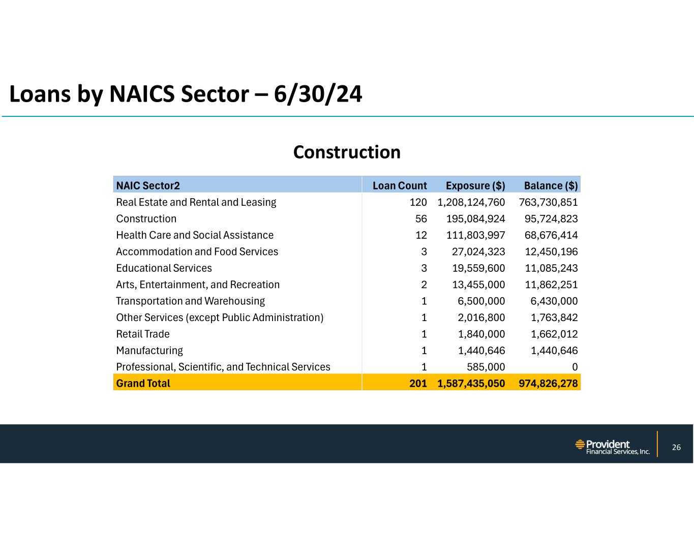 NYSE: PFS Construction Loans by NAICS Sector – 6/30/24 26 Balance ($)Exposure ($)Loan CountNAIC Sector2 763,730,8511,208,124,760120Real Estate and Rental and Leasing 95,724,823195,084,92456Construction 68,676,414111,803,99712Health Care and Social Assistance 12,450,19627,024,3233Accommodation and Food Services 11,085,24319,559,6003Educational Services 11,862,25113,455,0002Arts, Entertainment, and Recreation 6,430,0006,500,0001Transportation and Warehousing 1,763,8422,016,8001Other Services (except Public Administration) 1,662,0121,840,0001Retail Trade 1,440,6461,440,6461Manufacturing 0585,0001Professional, Scientific, and Technical Services 974,826,2781,587,435,050201Grand Total