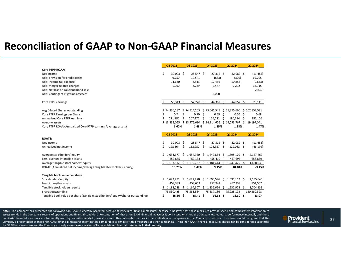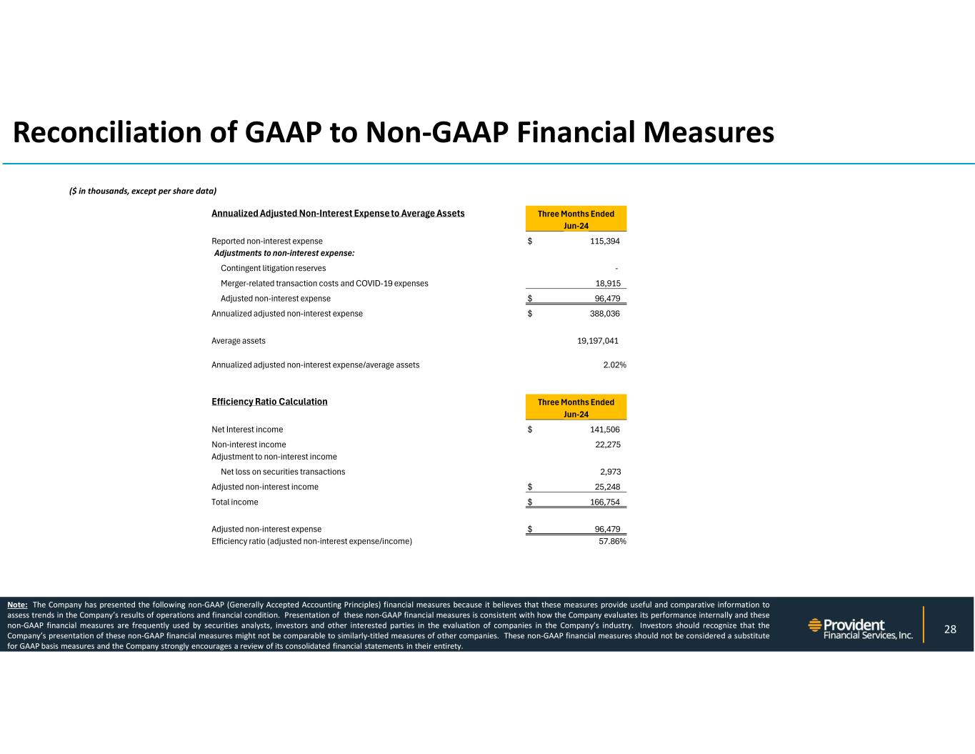 NYSE: PFS Note: The Company has presented the following non-GAAP (Generally Accepted Accounting Principles) financial measures because it believes that these measures provide useful and comparative information to assess trends in the Company’s results of operations and financial condition. Presentation of these non-GAAP financial measures is consistent with how the Company evaluates its performance internally and these non-GAAP financial measures are frequently used by securities analysts, investors and other interested parties in the evaluation of companies in the Company’s industry. Investors should recognize that the Company’s presentation of these non-GAAP financial measures might not be comparable to similarly-titled measures of other companies. These non-GAAP financial measures should not be considered a substitute for GAAP basis measures and the Company strongly encourages a review of its consolidated financial statements in their entirety. Reconciliation of GAAP to Non-GAAP Financial Measures 27 Q2 2024Q1 2024Q4 2023Q3 2023Q2 2023 Core PTPP ROAA: $ (11,485)$ 32,082 $ 27,312 $ 28,547 $ 32,003 Net Income 69,705 (320)(863)12,541 9,750 Add: provision for credit losses (9,833)10,888 12,456 8,843 11,630 Add: income tax expense 18,915 2,202 2,477 2,289 1,960 Add: merger related charges 2,839 Add: Net loss on Lakeland bond sale --3,000 Add: Contingent litigation reserves $ 70,141 $ 44,852 $ 44,382 $ 52,220 $ 55,343 Core PTPP earnings $ 102,957,521 $ 75,275,660 $ 75,041,545 $ 74,914,205 $ 74,830,187 Avg Diluted Shares outstanding $ 0.68 $ 0.60 $ 0.59 $ 0.70 $ 0.74 Core PTPP Earnings per Share $ 282,106 $ 180,394 $ 176,081 $ 207,177 $ 221,980 Annualized Core PTPP earnings $ 19,197,041 $ 14,093,767 $ 14,114,626 $ 13,976,610 $ 13,833,055 Average assets 1.47%1.28%1.25%1.48%1.60%Core PTPP ROAA (Annualized Core PTPP earnings/average assets) Q2 2024Q1 2024Q4 2023Q3 2023Q2 2023 ROATE: $ (11,485)$ 32,082 $ 27,312 $ 28,547 $ 32,003 Net income $ (46,192)$ 129,033 $ 108,357 $ 113,257 $ 128,364 Annualized net income $ 2,127,469 $ 1,698,170 $ 1,642,854 $ 1,654,920 $ 1,653,677 Average stockholders' equity 658,839 457,695 458,410 459,133 459,865 Less: average intangible assets $ 1,468,630 $ 1,240,475 $ 1,184,444 $ 1,195,787 $ 1,193,812 Average tangible stockholders' equity -3.15%10.40%9.15%9.47%10.75%ROATE (Annualized net income/average tangible stockholders' equity) Tangible book value per share: $ 2,555,646 $ 1,695,162 $ 1,690,596 $ 1,622,970 $ 1,642,471 Stockholders' equity 851,507 457,239 457,942 458,663 459,383 Less: intangible assets $ 1,704,139 $ 1,237,923 $ 1,232,654 $ 1,164,307 $ 1,183,088 Tangible stockholders' equity 130,380,393 75,928,193 75,537,186 75,531,884 75,530,425 Shares outstanding $ 13.07 $ 16.30 $ 16.32 $ 15.41 $ 15.66 Tangible book value per share (Tangible stockholders' equity/shares outstanding)