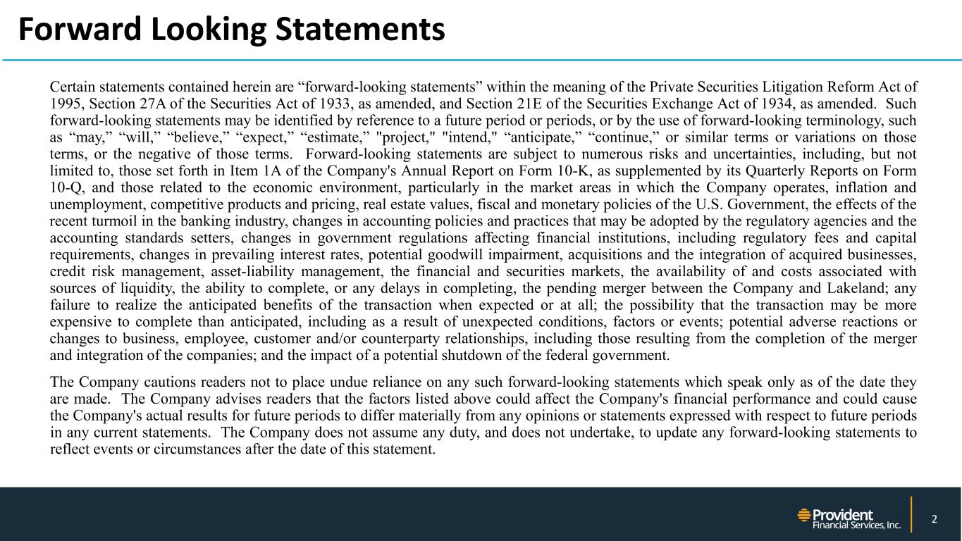 NYSE: PFS Forward Looking Statements Certain statements contained herein are “forward-looking statements” within the meaning of the Private Securities Litigation Reform Act of 1995, Section 27A of the Securities Act of 1933, as amended, and Section 21E of the Securities Exchange Act of 1934, as amended. Such forward-looking statements may be identified by reference to a future period or periods, or by the use of forward-looking terminology, such as “may,” “will,” “believe,” “expect,” “estimate,” "project," "intend," “anticipate,” “continue,” or similar terms or variations on those terms, or the negative of those terms. Forward-looking statements are subject to numerous risks and uncertainties, including, but not limited to, those set forth in Item 1A of the Company's Annual Report on Form 10-K, as supplemented by its Quarterly Reports on Form 10-Q, and those related to the economic environment, particularly in the market areas in which the Company operates, inflation and unemployment, competitive products and pricing, real estate values, fiscal and monetary policies of the U.S. Government, the effects of the recent turmoil in the banking industry, changes in accounting policies and practices that may be adopted by the regulatory agencies and the accounting standards setters, changes in government regulations affecting financial institutions, including regulatory fees and capital requirements, changes in prevailing interest rates, potential goodwill impairment, acquisitions and the integration of acquired businesses, credit risk management, asset-liability management, the financial and securities markets, the availability of and costs associated with sources of liquidity, the ability to complete, or any delays in completing, the pending merger between the Company and Lakeland; any failure to realize the anticipated benefits of the transaction when expected or at all; the possibility that the transaction may be more expensive to complete than anticipated, including as a result of unexpected conditions, factors or events; potential adverse reactions or changes to business, employee, customer and/or counterparty relationships, including those resulting from the completion of the merger and integration of the companies; and the impact of a potential shutdown of the federal government. The Company cautions readers not to place undue reliance on any such forward-looking statements which speak only as of the date they are made. The Company advises readers that the factors listed above could affect the Company's financial performance and could cause the Company's actual results for future periods to differ materially from any opinions or statements expressed with respect to future periods in any current statements. The Company does not assume any duty, and does not undertake, to update any forward-looking statements to reflect events or circumstances after the date of this statement. 2
