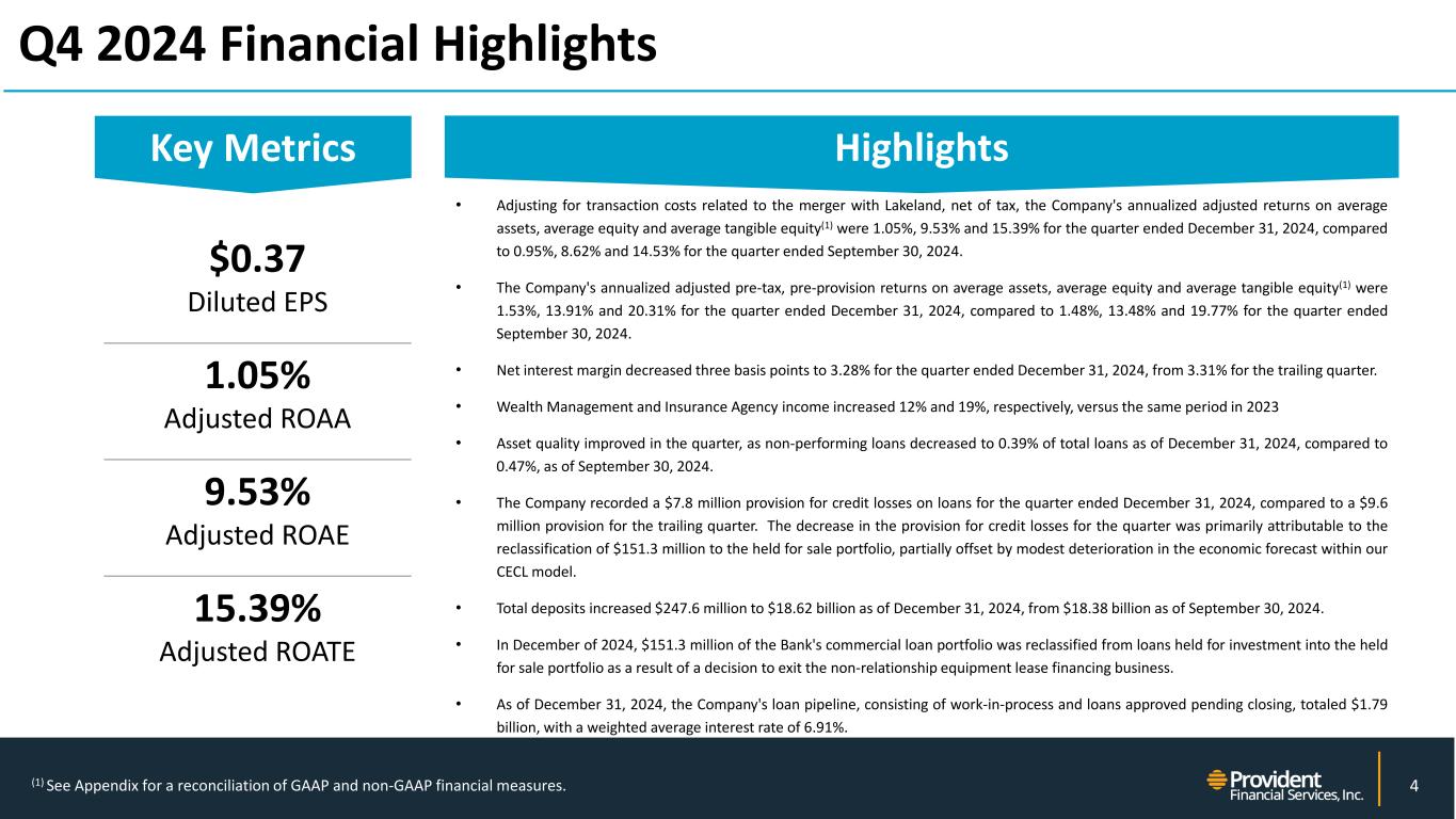 NYSE: PFS Corporate Profile (At or for the Quarter Ended 12/31/24) 3 Bank founded: 1839 Stock symbol: PFS (NYSE) Branches: 140 serving New Jersey, eastern Pennsylvania, and Orange, Queens, and Nassau Counties, New York Market capitalization: $2.5 Billion as of 1/27/2025 Balance sheet: $24.1 Billion in Total Assets $18.6 Billion in Net Loans $18.6 Billion in Total Deposits Strong core funding: 225 bps cost of total deposits Efficient operator: 1.90%: Annualized adjusted non- interest expenses / average assets(1) 55.43%: Efficiency Ratio(1) Wealth management business: Beacon Trust Company $4.2 Billion AUM Insurance business: Provident Protection Plus, Inc. 2024 revenues $16.2 Million (1) See Appendix for a reconciliation of GAAP and non-GAAP financial measures.