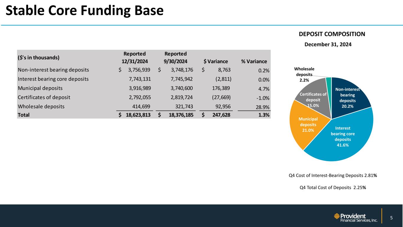 NYSE: PFS 4 Q4 2024 Financial Highlights $0.37 Diluted EPS 1.05% Adjusted ROAA 9.53% Adjusted ROAE 15.39% Adjusted ROATE Key Metrics Highlights • Adjusting for transaction costs related to the merger with Lakeland, net of tax, the Company's annualized adjusted returns on average assets, average equity and average tangible equity(1) were 1.05%, 9.53% and 15.39% for the quarter ended December 31, 2024, compared to 0.95%, 8.62% and 14.53% for the quarter ended September 30, 2024. • The Company's annualized adjusted pre-tax, pre-provision returns on average assets, average equity and average tangible equity(1) were 1.53%, 13.91% and 20.31% for the quarter ended December 31, 2024, compared to 1.48%, 13.48% and 19.77% for the quarter ended September 30, 2024. • Net interest margin decreased three basis points to 3.28% for the quarter ended December 31, 2024, from 3.31% for the trailing quarter. • Wealth Management and Insurance Agency income increased 12% and 19%, respectively, versus the same period in 2023 • Asset quality improved in the quarter, as non-performing loans decreased to 0.39% of total loans as of December 31, 2024, compared to 0.47%, as of September 30, 2024. • The Company recorded a $7.8 million provision for credit losses on loans for the quarter ended December 31, 2024, compared to a $9.6 million provision for the trailing quarter. The decrease in the provision for credit losses for the quarter was primarily attributable to the reclassification of $151.3 million to the held for sale portfolio, partially offset by modest deterioration in the economic forecast within our CECL model. • Total deposits increased $247.6 million to $18.62 billion as of December 31, 2024, from $18.38 billion as of September 30, 2024. • In December of 2024, $151.3 million of the Bank's commercial loan portfolio was reclassified from loans held for investment into the held for sale portfolio as a result of a decision to exit the non-relationship equipment lease financing business. • As of December 31, 2024, the Company's loan pipeline, consisting of work-in-process and loans approved pending closing, totaled $1.79 billion, with a weighted average interest rate of 6.91%. (1) See Appendix for a reconciliation of GAAP and non-GAAP financial measures.