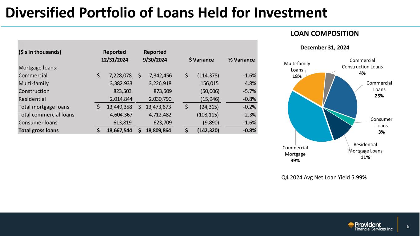 NYSE: PFS Stable Core Funding Base DEPOSIT COMPOSITION 5 Non-interest bearing deposits 20.2% Interest bearing core deposits 41.6% Municipal deposits 21.0% Certificates of deposit 15.0% Wholesale deposits 2.2% December 31, 2024 Q4 Cost of Interest-Bearing Deposits 2.81% Q4 Total Cost of Deposits 2.25% ($'s in thousands) Reported 12/31/2024 Reported 9/30/2024 $ Variance % Variance Non-interest bearing deposits $ 3,756,939 $ 3,748,176 $ 8,763 0.2% Interest bearing core deposits 7,743,131 7,745,942 (2,811) 0.0% Municipal deposits 3,916,989 3,740,600 176,389 4.7% Certificates of deposit 2,792,055 2,819,724 (27,669) -1.0% Wholesale deposits 414,699 321,743 92,956 28.9% Total $ 18,623,813 $ 18,376,185 $ 247,628 1.3%