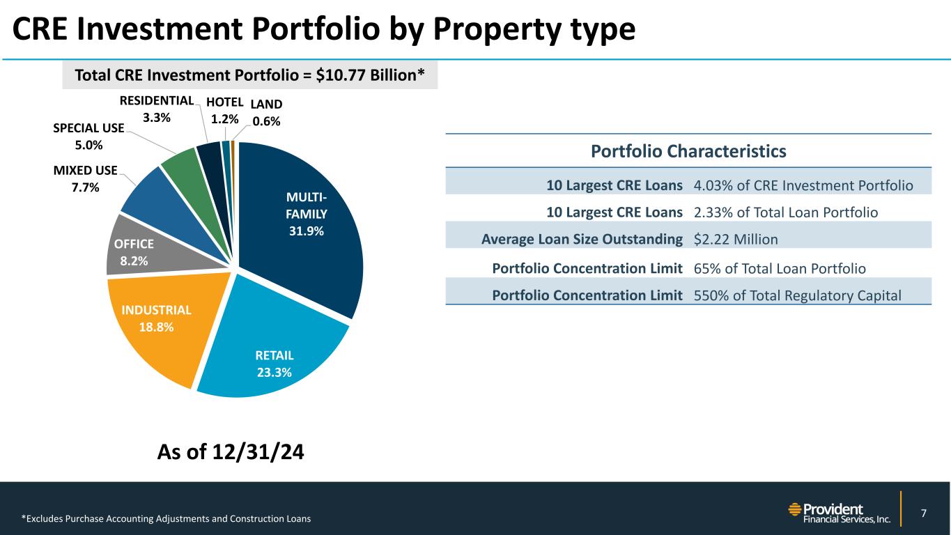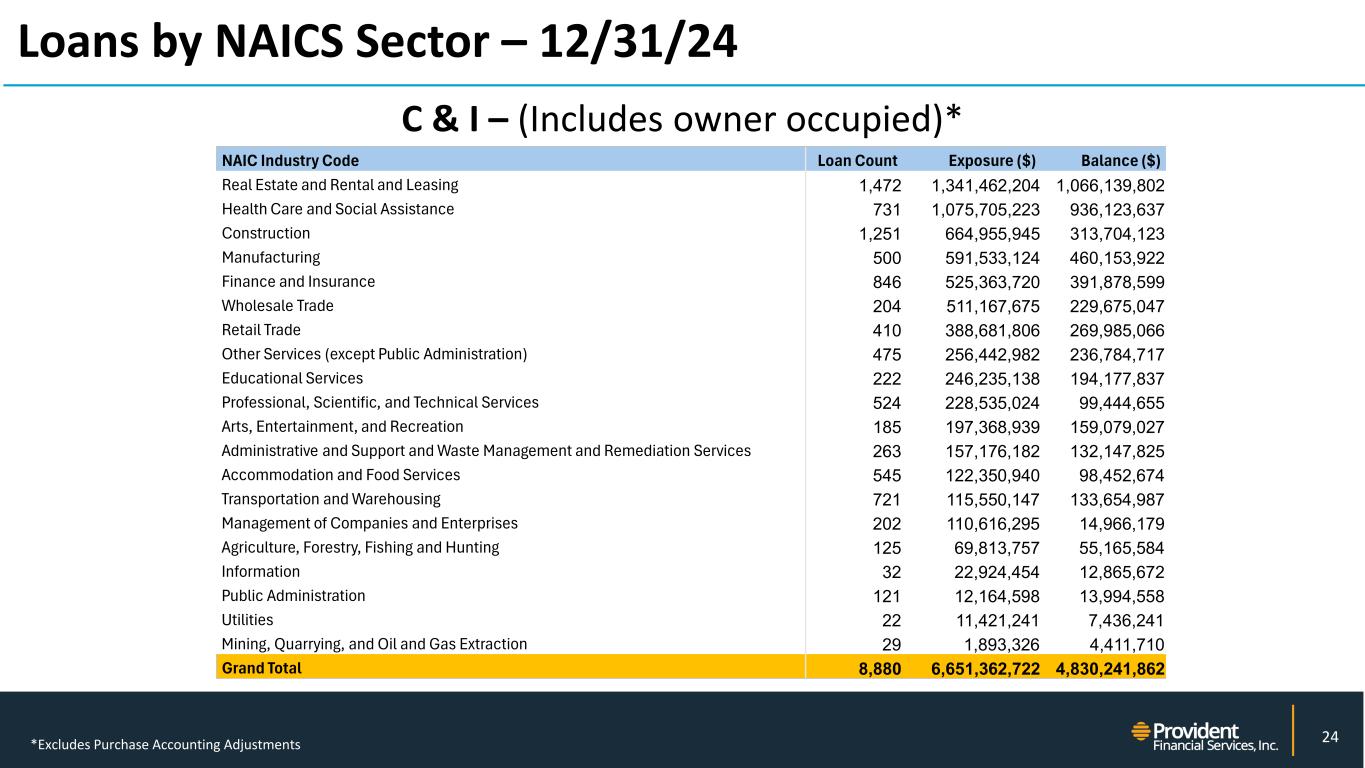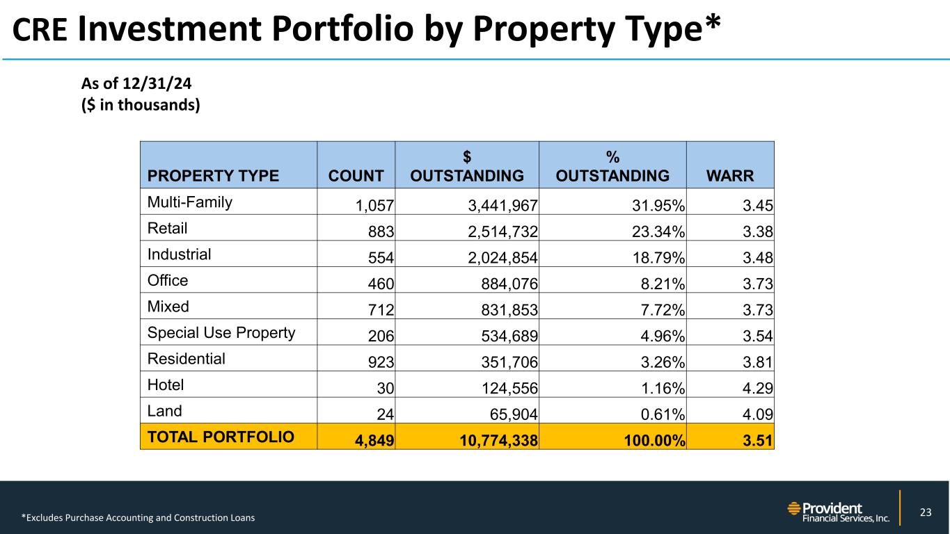 NYSE: PFS As of 12/31/24 ($ in thousands) CRE Investment Portfolio by Property Type* 23 PROPERTY TYPE COUNT $ OUTSTANDING % OUTSTANDING WARR Multi-Family 1,057 3,441,967 31.95% 3.45 Retail 883 2,514,732 23.34% 3.38 Industrial 554 2,024,854 18.79% 3.48 Office 460 884,076 8.21% 3.73 Mixed 712 831,853 7.72% 3.73 Special Use Property 206 534,689 4.96% 3.54 Residential 923 351,706 3.26% 3.81 Hotel 30 124,556 1.16% 4.29 Land 24 65,904 0.61% 4.09 TOTAL PORTFOLIO 4,849 10,774,338 100.00% 3.51 *Excludes Purchase Accounting and Construction Loans