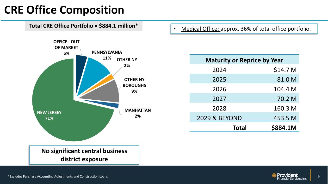 NYSE: PFS Multi-family Composition (NY and Rent Stabilized sectors) 8 OTHER NY BOROUGHS 63% OTHER NY 25% MANHATTAN 12% Total NY Multi-family Loans = $446.5 Million Total multi-family loan portfolio: $3.34 Billion • Of the total, 88 Loans on multi-family properties in the five boroughs of NYC, aggregate outstanding $244.5 million, with an average loan size of $2.8 million. Rent stabilized loan portfolio: <0.80% of total loan portfolio • All performing • Largest loan: $41.8 million with 67% LTV and 1.26x DSCR Multi-family balances by origination Year: • NY 2024 loans: $36.5 MM • NY 2023 loans: $77.5 MM • NY 2022 loans: $124.4 MM • NY 2021 loans: $50.5 MM • NY 2020 and prior loans: $157.6 MM • All Multi-family 2024 loans: $261.4 MM • All Multi-family 2023 loans: $415.4 MM • All Multi-family 2022 loans: $628.1 MM • All Multi-family 2021 loans: $497.6 MM • All Multi-family 2020 and prior loans: $1.64 B *Excludes Purchase Accounting Adjustments and Construction Loans