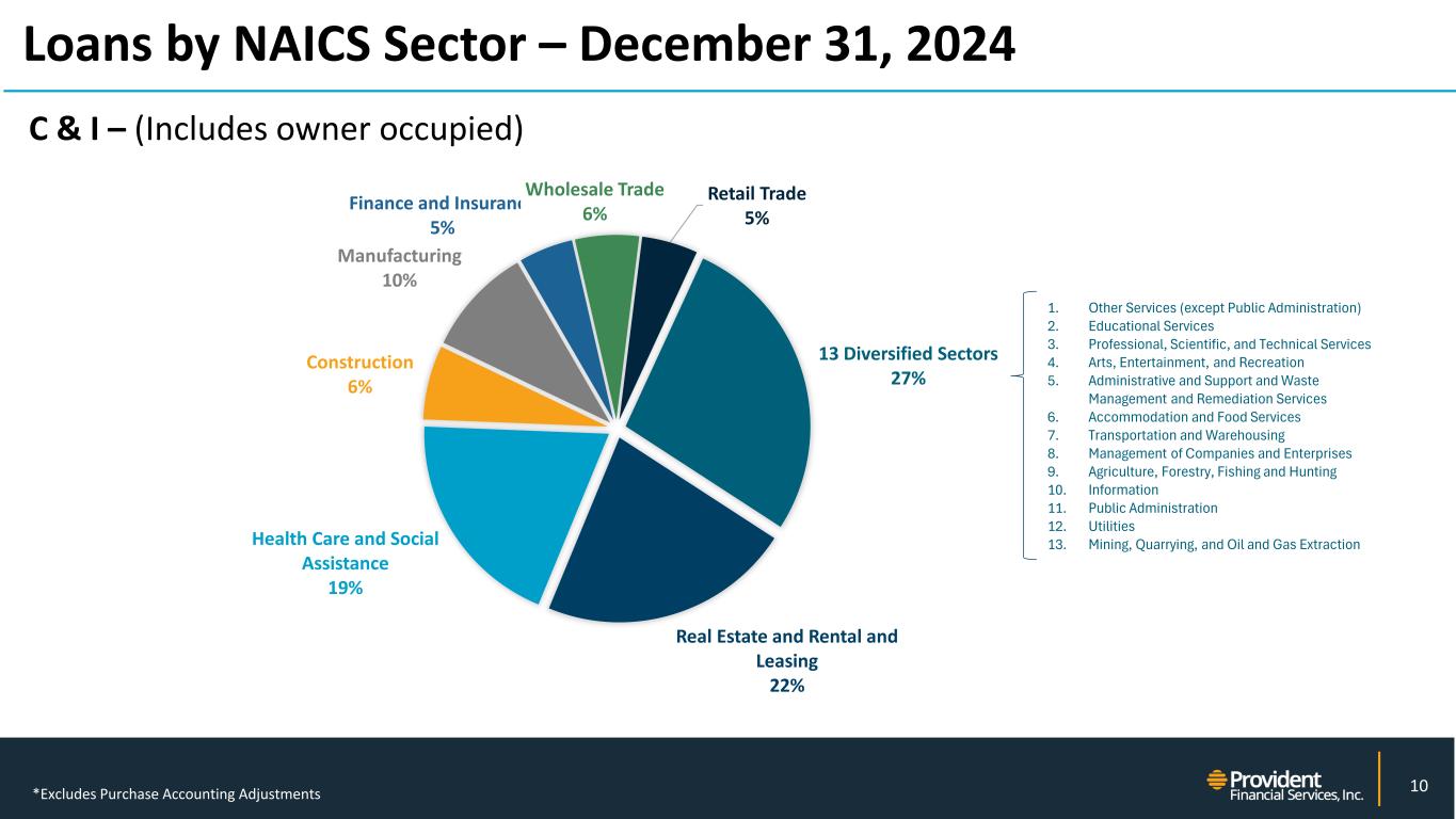 NYSE: PFS CRE Office Composition 9 • Medical Office: approx. 36% of total office portfolio. Maturity or Reprice by Year 2024 $14.7 M 2025 81.0 M 2026 104.4 M 2027 70.2 M 2028 160.3 M 2029 & BEYOND 453.5 M Total $884.1M OFFICE - OUT OF MARKET 5% PENNSYLVANIA 11% OTHER NY 2% OTHER NY BOROUGHS 9% MANHATTAN 2% NEW JERSEY 71% No significant central business district exposure Total CRE Office Portfolio = $884.1 million* *Excludes Purchase Accounting Adjustments and Construction Loans