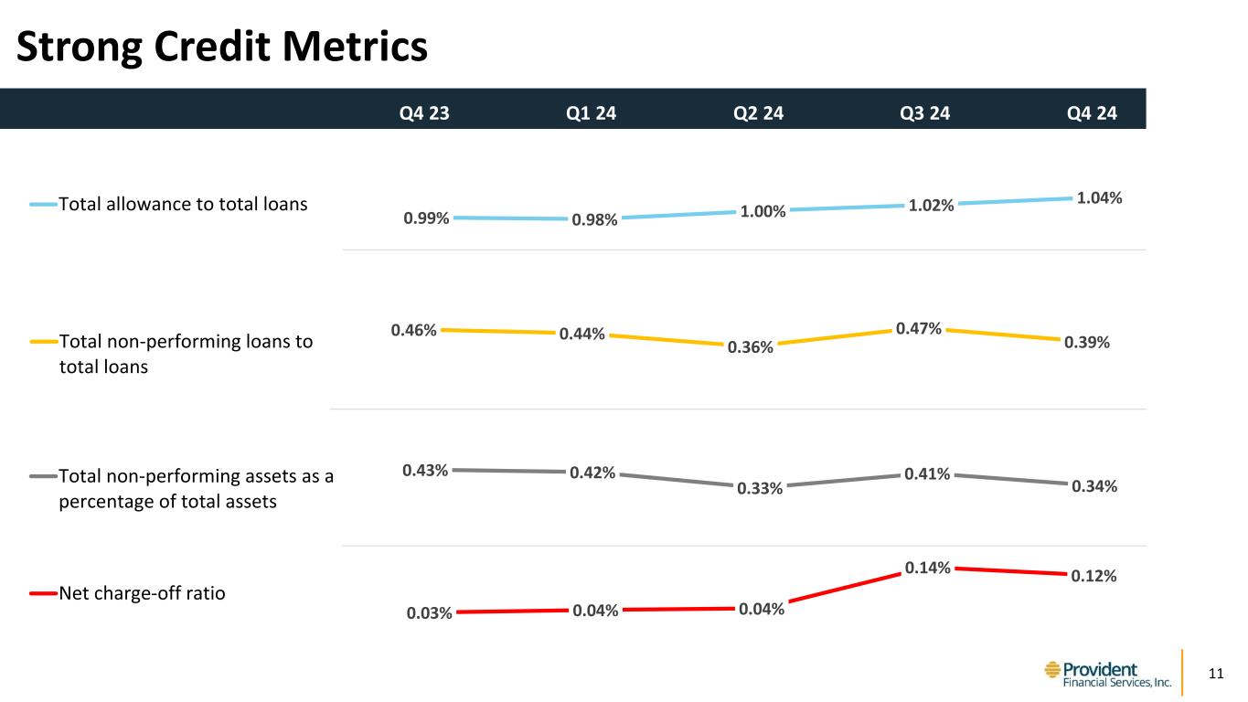 Strong Credit Metrics 11 0.99% 0.98% 1.00% 1.02% 1.04%Total allowance to total loans 0.46% 0.44% 0.36% 0.47% 0.39%Total non-performing loans to total loans 0.43% 0.42% 0.33% 0.41% 0.34%Total non-performing assets as a percentage of total assets 0.03% 0.04% 0.04% 0.14% 0.12% Net charge-off ratio Q4 23 Q3 24 Q4 24Q1 24 Q2 24