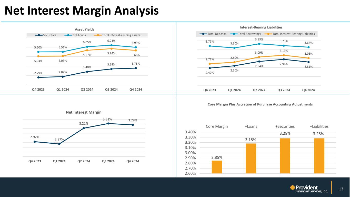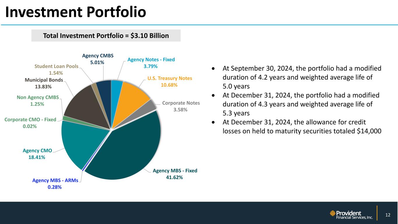 NYSE: PFS Agency Notes - Fixed 3.79% U.S. Treasury Notes 10.68% Corporate Notes 3.58% Agency MBS - Fixed 41.62%Agency MBS - ARMs 0.28% Agency CMO 18.41% Corporate CMO - Fixed 0.02% Non Agency CMBS 1.25% Municipal Bonds 13.83% Student Loan Pools 1.54% Agency CMBS 5.01% Investment Portfolio 12 Total Investment Portfolio = $3.10 Billion • At September 30, 2024, the portfolio had a modified duration of 4.2 years and weighted average life of 5.0 years • At December 31, 2024, the portfolio had a modified duration of 4.3 years and weighted average life of 5.3 years • At December 31, 2024, the allowance for credit losses on held to maturity securities totaled $14,000