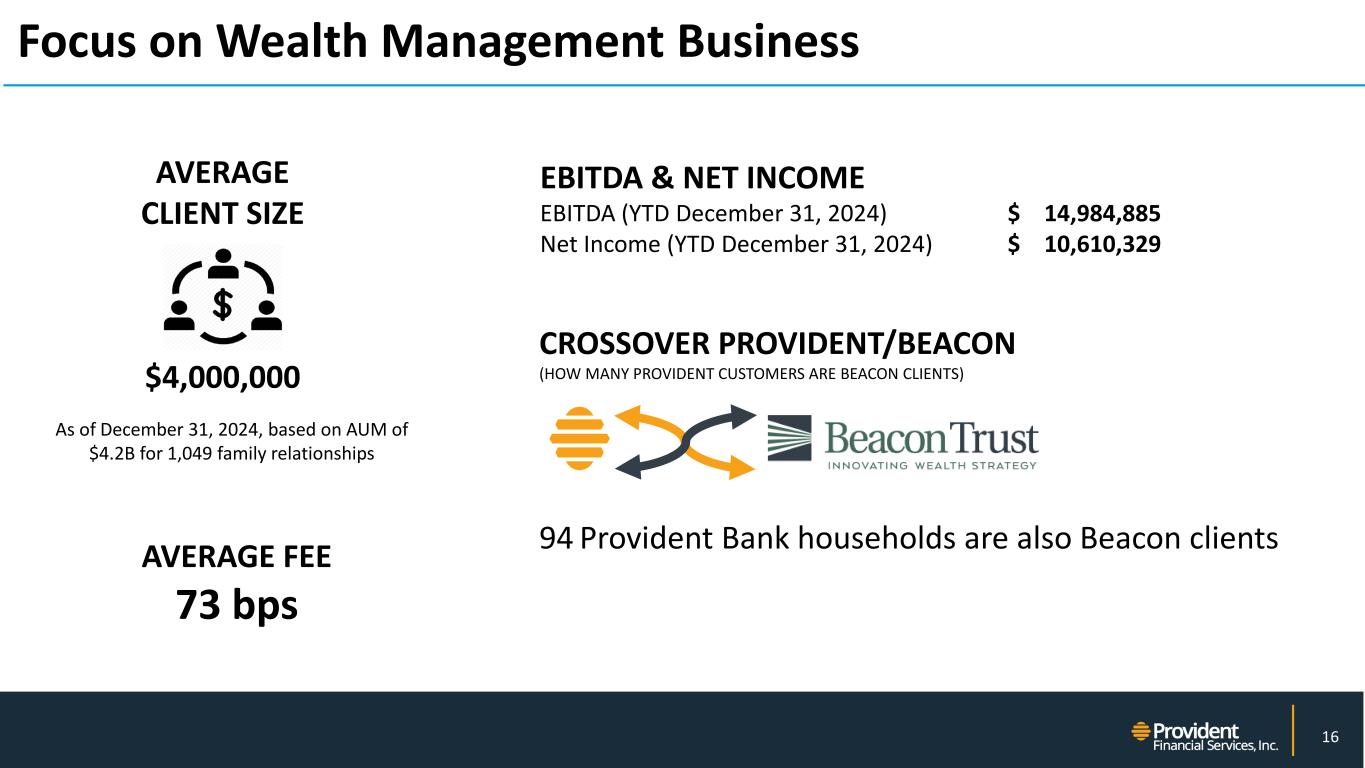 NYSE: PFS * Represents interest on lines of credit to Beacon clients, whose investment accounts are pledged as collateral. Advisory 87% Trust & Estate 8% Tax 2% Private Banking 3% Focus on Wealth Management Business 15 $4.2 Billion AUM For 1,049 family relationships 2024 YTD Revenue Advisory $ 27,527,601 Trust & Estate $ 2,415,427 Tax $ 590,629 Interest Income $ 1,002,554 * Total $ 31,536,211