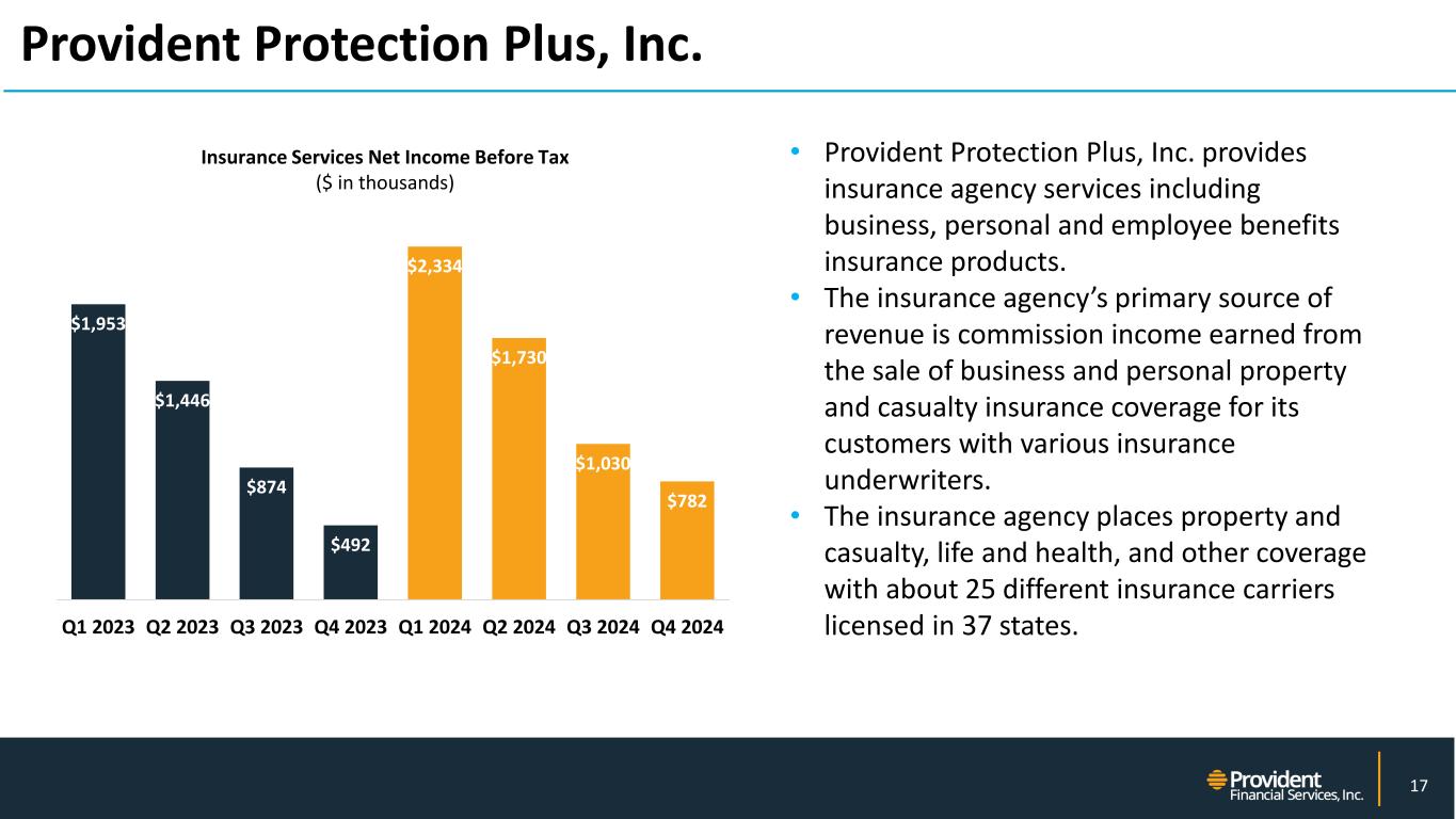 NYSE: PFS • Provident Protection Plus, Inc. provides insurance agency services including business, personal and employee benefits insurance products. • The insurance agency’s primary source of revenue is commission income earned from the sale of business and personal property and casualty insurance coverage for its customers with various insurance underwriters. • The insurance agency places property and casualty, life and health, and other coverage with about 25 different insurance carriers licensed in 37 states. Provident Protection Plus, Inc. 17 $1,953 $1,446 $874 $492 $2,334 $1,730 $1,030 $782 Q1 2023 Q2 2023 Q3 2023 Q4 2023 Q1 2024 Q2 2024 Q3 2024 Q4 2024 Insurance Services Net Income Before Tax ($ in thousands)