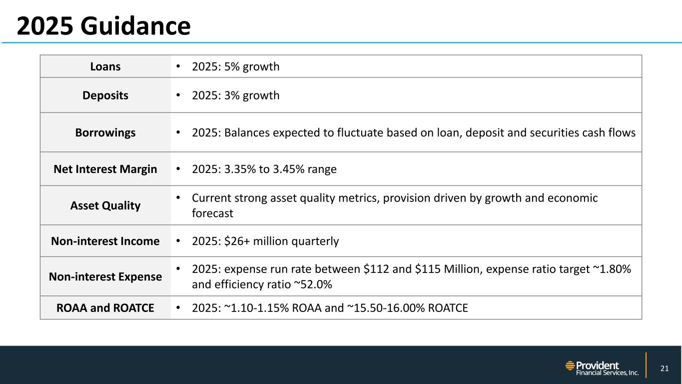 NYSE: PFS Guideline is 300% of Regulatory Capital CRE to Total Risk-Based Capital 20 485.9% 472.1% 468.4% 466.2% 460.8% 0.00% 100.00% 200.00% 300.00% 400.00% 500.00% 600.00% 12/31/23 03/31/24 06/30/24 9/30/2024 12/31/2024
