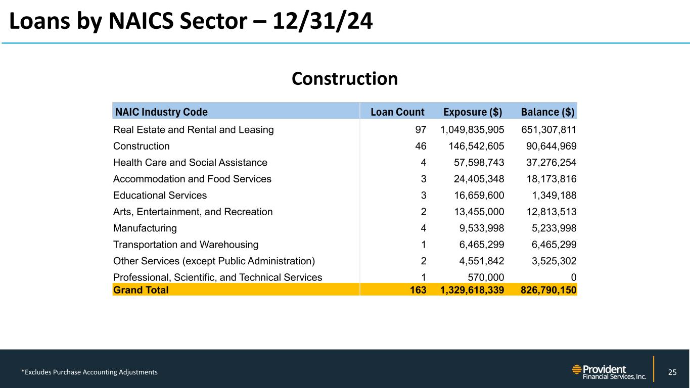 NYSE: PFS C & I – (Includes owner occupied)* Loans by NAICS Sector – 12/31/24 24*Excludes Purchase Accounting Adjustments NAIC Industry Code Loan Count Exposure ($) Balance ($) Real Estate and Rental and Leasing 1,472 1,341,462,204 1,066,139,802 Health Care and Social Assistance 731 1,075,705,223 936,123,637 Construction 1,251 664,955,945 313,704,123 Manufacturing 500 591,533,124 460,153,922 Finance and Insurance 846 525,363,720 391,878,599 Wholesale Trade 204 511,167,675 229,675,047 Retail Trade 410 388,681,806 269,985,066 Other Services (except Public Administration) 475 256,442,982 236,784,717 Educational Services 222 246,235,138 194,177,837 Professional, Scientific, and Technical Services 524 228,535,024 99,444,655 Arts, Entertainment, and Recreation 185 197,368,939 159,079,027 Administrative and Support and Waste Management and Remediation Services 263 157,176,182 132,147,825 Accommodation and Food Services 545 122,350,940 98,452,674 Transportation and Warehousing 721 115,550,147 133,654,987 Management of Companies and Enterprises 202 110,616,295 14,966,179 Agriculture, Forestry, Fishing and Hunting 125 69,813,757 55,165,584 Information 32 22,924,454 12,865,672 Public Administration 121 12,164,598 13,994,558 Utilities 22 11,421,241 7,436,241 Mining, Quarrying, and Oil and Gas Extraction 29 1,893,326 4,411,710 Grand Total 8,880 6,651,362,722 4,830,241,862