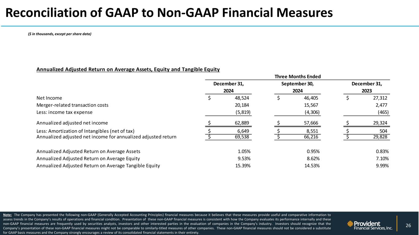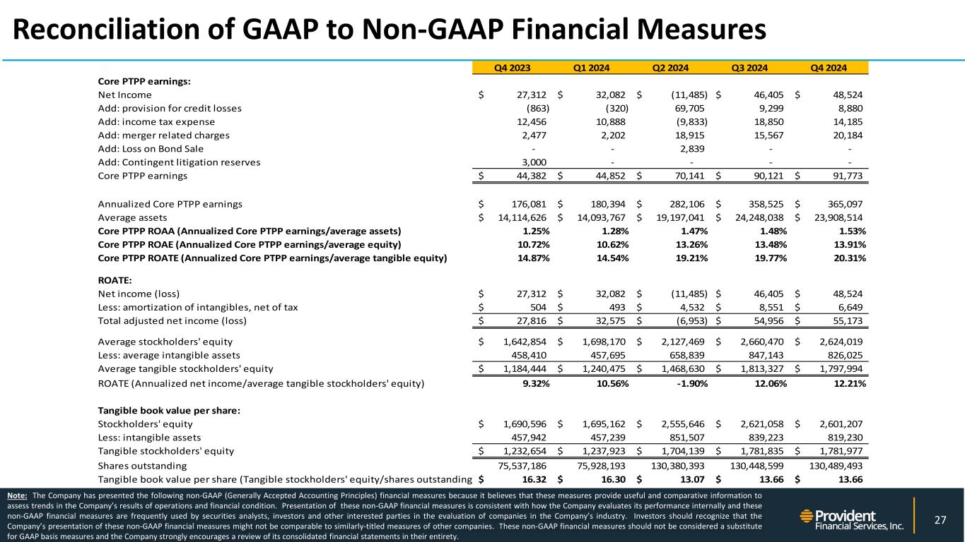 NYSE: PFS Note: The Company has presented the following non-GAAP (Generally Accepted Accounting Principles) financial measures because it believes that these measures provide useful and comparative information to assess trends in the Company’s results of operations and financial condition. Presentation of these non-GAAP financial measures is consistent with how the Company evaluates its performance internally and these non-GAAP financial measures are frequently used by securities analysts, investors and other interested parties in the evaluation of companies in the Company’s industry. Investors should recognize that the Company’s presentation of these non-GAAP financial measures might not be comparable to similarly-titled measures of other companies. These non-GAAP financial measures should not be considered a substitute for GAAP basis measures and the Company strongly encourages a review of its consolidated financial statements in their entirety. ($ in thousands, except per share data) Reconciliation of GAAP to Non-GAAP Financial Measures 26 Annualized Adjusted Return on Average Assets, Equity and Tangible Equity December 31, September 30, December 31, 2024 2024 2023 Net Income 48,524$ 46,405$ 27,312$ Merger-related transaction costs 20,184 15,567 2,477 Less: income tax expense (5,819) (4,306) (465) Annualized adjusted net income 62,889$ 57,666$ 29,324$ Less: Amortization of Intangibles (net of tax) 6,649$ 8,551$ 504$ Annualized adjusted net income for annualized adjusted return 69,538$ 66,216$ 29,828$ Annualized Adjusted Return on Average Assets 1.05% 0.95% 0.83% Annualized Adjusted Return on Average Equity 9.53% 8.62% 7.10% Annualized Adjusted Return on Average Tangible Equity 15.39% 14.53% 9.99% Three Months Ended