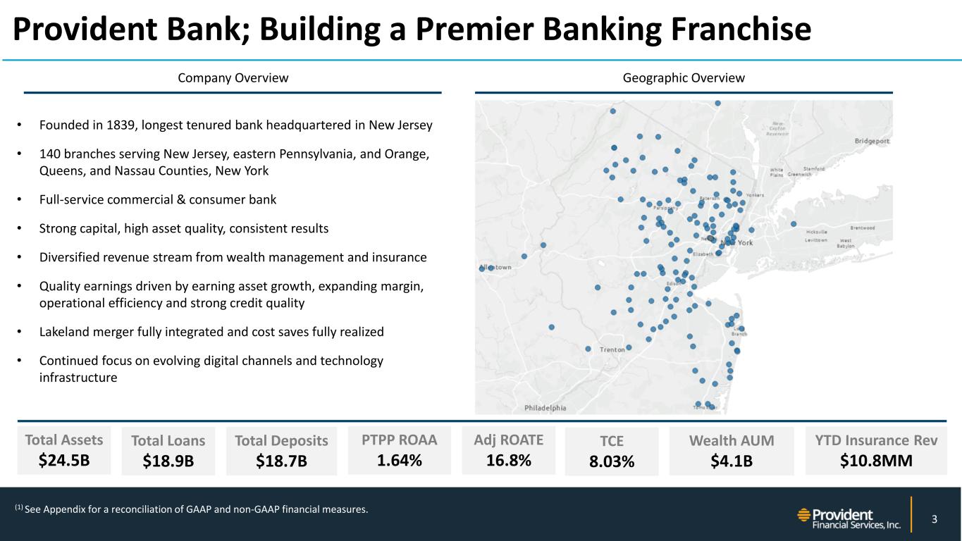 NYSE: PFS Forward Looking Statements Certain statements contained herein are “forward-looking statements” within the meaning of the Private Securities Litigation Reform Act of 1995, Section 27A of the Securities Act of 1933, as amended, and Section 21E of the Securities Exchange Act of 1934, as amended. Such forward-looking statements may be identified by reference to a future period or periods, or by the use of forward-looking terminology, such as “may,” “will,” “believe,” “expect,” “estimate,” "project," "intend," “anticipate,” “continue,” or similar terms or variations on those terms, or the negative of those terms. Forward-looking statements are subject to numerous risks and uncertainties, including, but not limited to, those set forth in Item 1A of the Company's Annual Report on Form 10-K, as supplemented by its Quarterly Reports on Form 10-Q, and those related to the economic environment, particularly in the market areas in which the Company operates, inflation and unemployment, competitive products and pricing, real estate values, fiscal and monetary policies of the U.S. Government, tariffs, the effects of the recent turmoil in the banking industry, changes in accounting policies and practices that may be adopted by the regulatory agencies and the accounting standards setters, changes in government regulations affecting financial institutions, including regulatory fees and capital requirements, changes in prevailing interest rates, potential goodwill impairment, acquisitions and the integration of acquired businesses, credit risk management, asset-liability management, the financial and securities markets, the availability of and costs associated with sources of liquidity, and the impact of a potential shutdown of the federal government. The Company cautions readers not to place undue reliance on any such forward-looking statements which speak only as of the date they are made. The Company advises readers that the factors listed above could affect the Company's financial performance and could cause the Company's actual results for future periods to differ materially from any opinions or statements expressed with respect to future periods in any current statements. The Company does not assume any duty, and does not undertake, to update any forward-looking statements to reflect events or circumstances after the date of this statement. 2