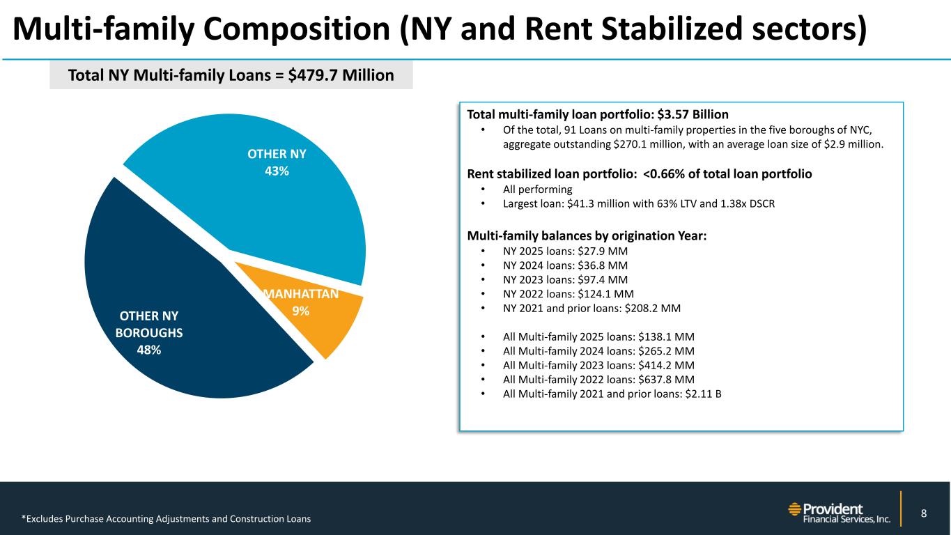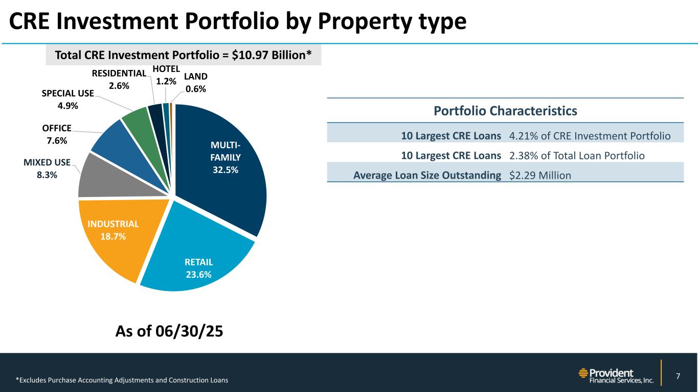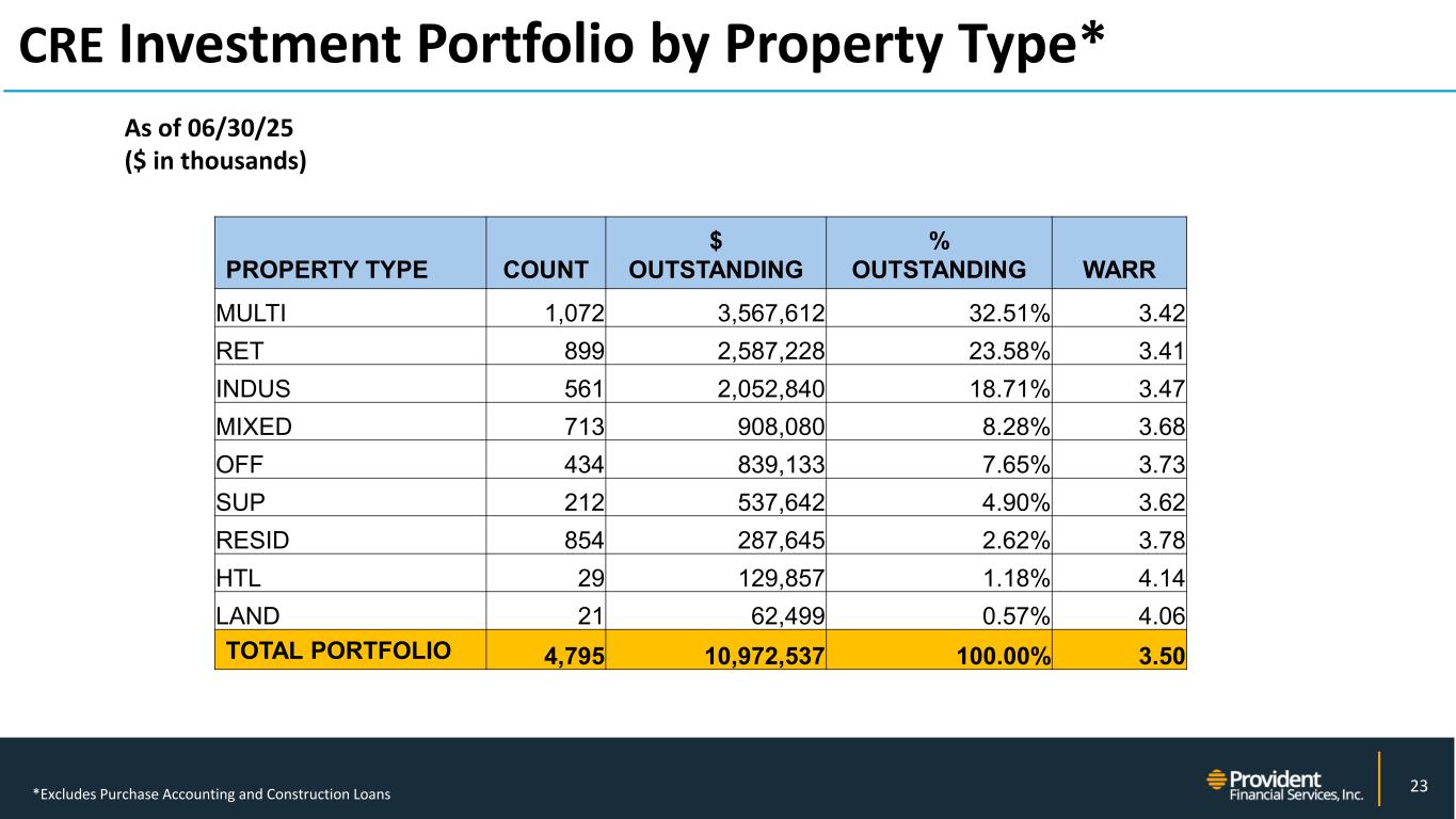 NYSE: PFS As of 06/30/25 ($ in thousands) CRE Investment Portfolio by Property Type* 23*Excludes Purchase Accounting and Construction Loans PROPERTY TYPE COUNT $ OUTSTANDING % OUTSTANDING WARR MULTI 1,072 3,567,612 32.51% 3.42 RET 899 2,587,228 23.58% 3.41 INDUS 561 2,052,840 18.71% 3.47 MIXED 713 908,080 8.28% 3.68 OFF 434 839,133 7.65% 3.73 SUP 212 537,642 4.90% 3.62 RESID 854 287,645 2.62% 3.78 HTL 29 129,857 1.18% 4.14 LAND 21 62,499 0.57% 4.06 TOTAL PORTFOLIO 4,795 10,972,537 100.00% 3.50