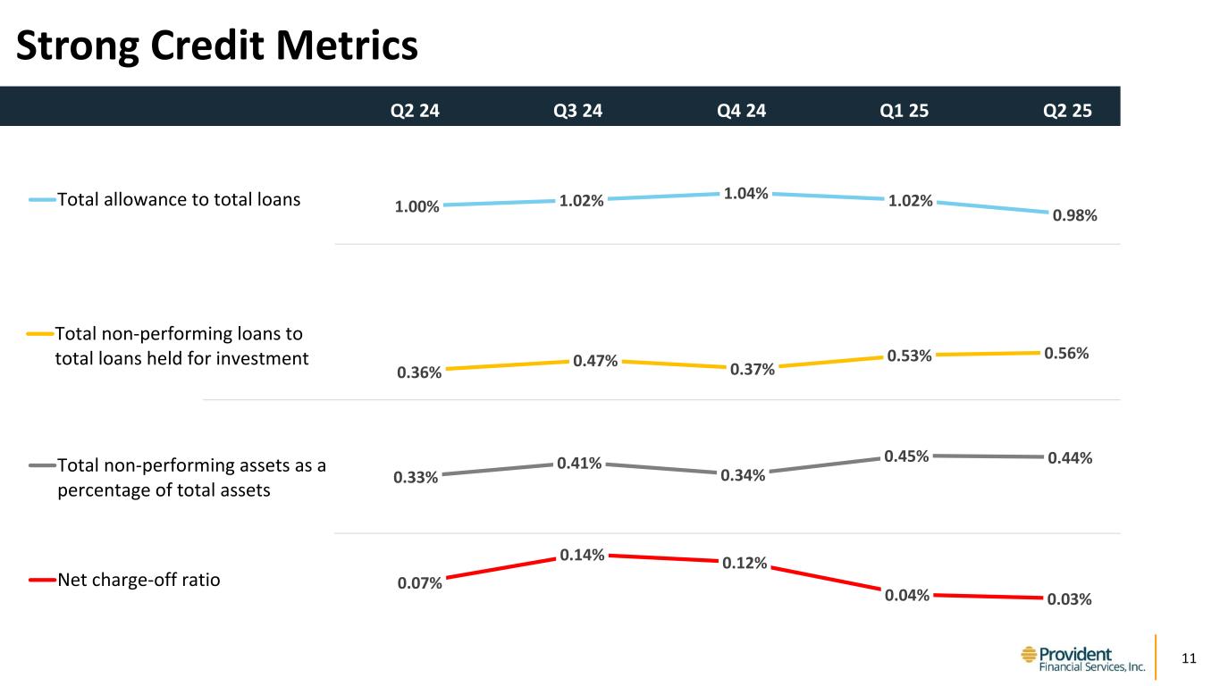 NYSE: PFS C & I – (Includes owner occupied) Loans by NAICS Sector – June 30, 2025 10 Health Care and Social Assistance 22% Real Estate and Rental and Leasing 11% Wholesale Trade 8% Construction 7% Manufacturing 10% Finance and Insurance 6% Retail Trade 7% 13 Diversified Sectors 29% 1. Accommodation and Food Services 2. Administrative and Support and Waste Management and Remediation Services 3. Agriculture, Forestry, Fishing and Hunting 4. Arts, Entertainment, and Recreation 5. Educational Services 6. Information 7. Management of Companies and Enterprises 8. Mining, Quarrying, and Oil and Gas Extraction 9. Other Services (except Public Administration) 10. Professional, Scientific, and Technical Services 11. Public Administration 12. Transportation and Warehousing 13. Utilities *Excludes Purchase Accounting Adjustments