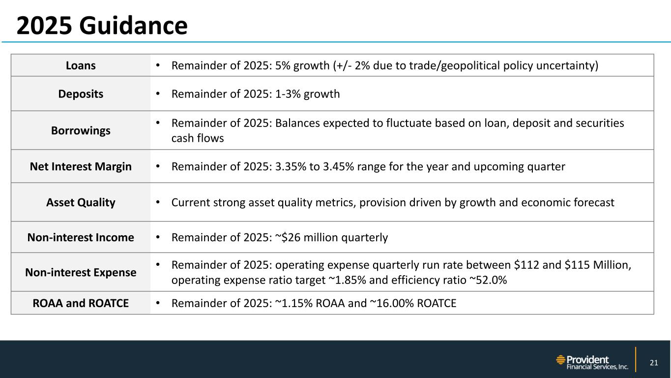 NYSE: PFS Note: The Company has presented the following non-GAAP (Generally Accepted Accounting Principles) financial measures because it believes that these measures provide useful and comparative information to assess trends in the Company’s results of operations and financial condition. Presentation of these non-GAAP financial measures is consistent with how the Company evaluates its performance internally and these non-GAAP financial measures are frequently used by securities analysts, investors and other interested parties in the evaluation of companies in the Company’s industry. Investors should recognize that the Company’s presentation of these non-GAAP financial measures might not be comparable to similarly-titled measures of other companies. These non-GAAP financial measures should not be considered a substitute for GAAP basis measures and the Company strongly encourages a review of its consolidated financial statements in their entirety. ($ in thousands, except per share data) Reconciliation of GAAP to Non-GAAP Financial Measures 28 Annualized Adjusted Non-Interest Expense to Average Assets Three Months Ended June 30, 2025 Reported non-interest expense 114,614$ Adjustments to non-interest expense: Write-down on ORE property - Merger-related transaction costs and COVID-19 expenses - Adjusted non-interest expense 114,614$ Annualized adjusted non-interest expense 459,715$ Average assets 24,349,808 Annualized adjusted non-interest expense/average assets 1.89% Efficiency Ratio Calculation Three Months Ended June 30, 2025 Net Interest income 187,094$ Non-interest income 27,075 Adjustment to non-interest income Net gain on securities transactions - Adjusted non-interest income 27,075$ Total income 214,169$ Adjusted non-interest expense 114,614$ Efficiency ratio (adjusted non-interest expense/income) 53.52%