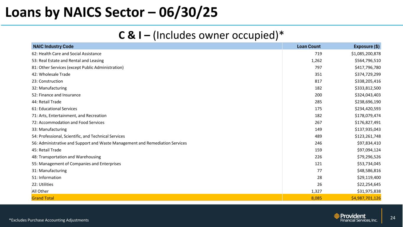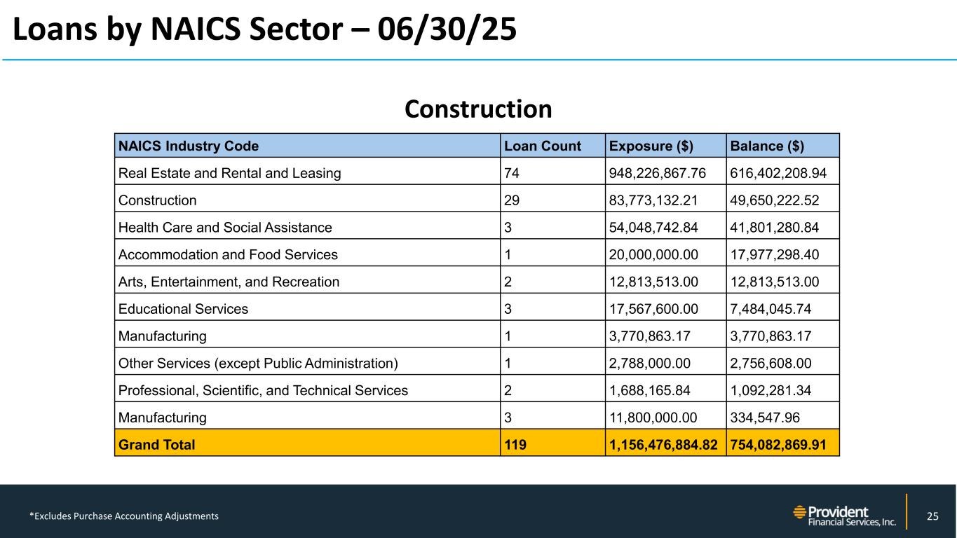 NYSE: PFS C & I – (Includes owner occupied)* Loans by NAICS Sector – 06/30/25 24*Excludes Purchase Accounting Adjustments NAIC Industry Code Loan Count Exposure ($) 62: Health Care and Social Assistance 719 $1,085,200,878 53: Real Estate and Rental and Leasing 1,262 $564,796,510 81: Other Services (except Public Administration) 797 $417,796,780 42: Wholesale Trade 351 $374,729,299 23: Construction 817 $338,205,416 32: Manufacturing 182 $333,812,500 52: Finance and Insurance 200 $324,043,403 44: Retail Trade 285 $238,696,190 61: Educational Services 175 $234,420,593 71: Arts, Entertainment, and Recreation 182 $178,079,474 72: Accommodation and Food Services 267 $176,827,491 33: Manufacturing 149 $137,935,043 54: Professional, Scientific, and Technical Services 489 $123,261,748 56: Administrative and Support and Waste Management and Remediation Services 246 $97,834,410 45: Retail Trade 159 $97,094,124 48: Transportation and Warehousing 226 $79,296,526 55: Management of Companies and Enterprises 121 $53,734,045 31: Manufacturing 77 $48,586,816 51: Information 28 $29,119,400 22: Utilities 26 $22,254,645 All Other 1,327 $31,975,838 Grand Total 8,085 $4,987,701,126