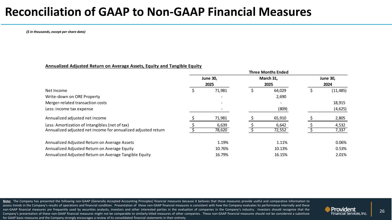 NYSE: PFS Note: The Company has presented the following non-GAAP (Generally Accepted Accounting Principles) financial measures because it believes that these measures provide useful and comparative information to assess trends in the Company’s results of operations and financial condition. Presentation of these non-GAAP financial measures is consistent with how the Company evaluates its performance internally and these non-GAAP financial measures are frequently used by securities analysts, investors and other interested parties in the evaluation of companies in the Company’s industry. Investors should recognize that the Company’s presentation of these non-GAAP financial measures might not be comparable to similarly-titled measures of other companies. These non-GAAP financial measures should not be considered a substitute for GAAP basis measures and the Company strongly encourages a review of its consolidated financial statements in their entirety. ($ in thousands, except per share data) Reconciliation of GAAP to Non-GAAP Financial Measures 26 Annualized Adjusted Return on Average Assets, Equity and Tangible Equity June 30, March 31, June 30, 2025 2025 2024 Net Income 71,981$ 64,029$ (11,485)$ Write-down on ORE Property - 2,690 Merger-related transaction costs - - 18,915 Less: income tax expense - (809) (4,625) Annualized adjusted net income 71,981$ 65,910$ 2,805$ Less: Amortization of Intangibles (net of tax) 6,639$ 6,642$ 4,532$ Annualized adjusted net income for annualized adjusted return 78,620$ 72,552$ 7,337$ Annualized Adjusted Return on Average Assets 1.19% 1.11% 0.06% Annualized Adjusted Return on Average Equity 10.76% 10.13% 0.53% Annualized Adjusted Return on Average Tangible Equity 16.79% 16.15% 2.01% Three Months Ended