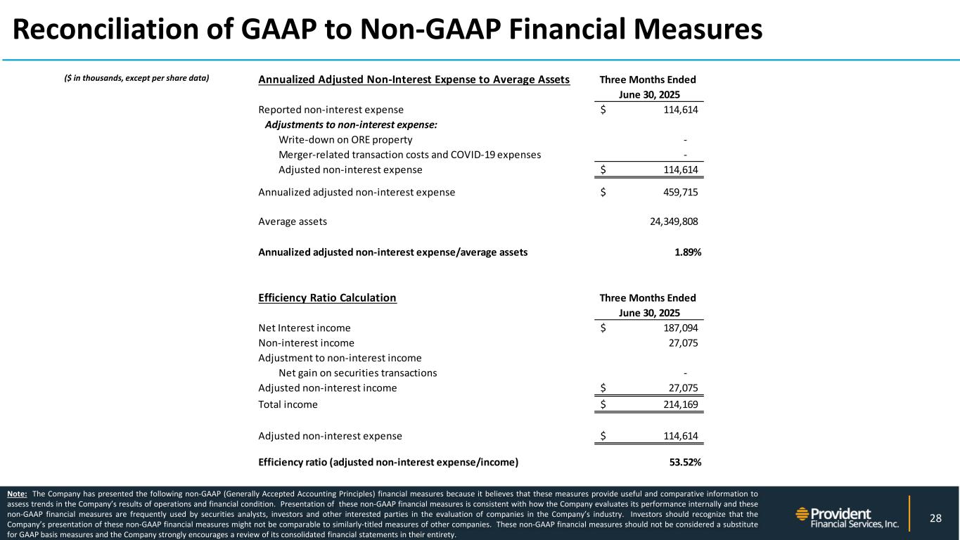 NYSE: PFS Note: The Company has presented the following non-GAAP (Generally Accepted Accounting Principles) financial measures because it believes that these measures provide useful and comparative information to assess trends in the Company’s results of operations and financial condition. Presentation of these non-GAAP financial measures is consistent with how the Company evaluates its performance internally and these non-GAAP financial measures are frequently used by securities analysts, investors and other interested parties in the evaluation of companies in the Company’s industry. Investors should recognize that the Company’s presentation of these non-GAAP financial measures might not be comparable to similarly-titled measures of other companies. These non-GAAP financial measures should not be considered a substitute for GAAP basis measures and the Company strongly encourages a review of its consolidated financial statements in their entirety. Reconciliation of GAAP to Non-GAAP Financial Measures 27 Q2 2024 Q3 2024 Q4 2024 Q1 2025 Q2 2025 Core PTPP earnings: Net Income (11,485)$ 46,405$ 48,524$ 64,028$ 71,981$ Add: provision for credit losses 69,705 9,299 8,880 638 (2,888) Add: income tax expense (9,833) 18,850 14,185 27,825 30,462 Add: merger related charges 18,915 15,567 20,184 - - Add: Loss on Bond Sale 2,839 - - - - Add: Write-down on ORE property - - - 2,690 - Core PTPP earnings 70,141$ 90,121$ 91,773$ 95,181$ 99,555$ Annualized Core PTPP earnings 282,106$ 358,525$ 365,097$ 386,012$ 399,314$ Average assets 19,197,041$ 24,248,038$ 23,908,514$ 24,049,318$ 24,349,808$ Core PTPP ROAA (Annualized Core PTPP earnings/average assets) 1.47% 1.48% 1.53% 1.61% 1.64% Core PTPP ROAE (Annualized Core PTPP earnings/average equity) 13.26% 13.48% 13.91% 14.63% 14.88% Core PTPP ROATE (Annualized Core PTPP earnings/average tangible equity) 19.21% 19.77% 20.31% 21.18% 21.26% ROATE: Net income (loss) (11,485)$ 46,405$ 48,524$ 64,028$ 71,981$ Less: amortization of intangibles, net of tax 4,532$ 8,551$ 6,649$ 6,642$ 6,639$ Total adjusted net income (loss) (6,953)$ 54,956$ 55,173$ 70,670$ 78,620$ Annualized adjusted net income (loss) (27,965)$ 218,629$ 219,493$ 286,606$ 318,848$ Average stockholders' equity 2,127,469$ 2,660,470$ 2,624,019$ 2,638,361$ 2,684,342$ Less: average intangible assets 658,839 847,143 826,025 815,954 806,419 Average tangible stockholders' equity 1,468,630$ 1,813,327$ 1,797,994$ 1,822,407$ 1,877,923$ ROATE (Annualized net income/average tangible stockholders' equity) -1.90% 12.06% 12.21% 15.73% 16.79% Tangible book value per share: Stockholders' equity 2,555,646$ 2,621,058$ 2,601,207$ 2,658,794$ 2,707,555$ Less: intangible assets 851,507 839,223 819,230 809,725 800,232 Tangible stockholders' equity 1,704,139$ 1,781,835$ 1,781,977$ 1,849,069$ 1,907,323$ Shares outstanding 130,380,393 130,448,599 130,489,493 130,663,184 130,624,243 Tangible book value per share (Tangible stockholders' equity/shares outstanding) 13.07$ 13.66$ 13.66$ 14.15$ 14.60$