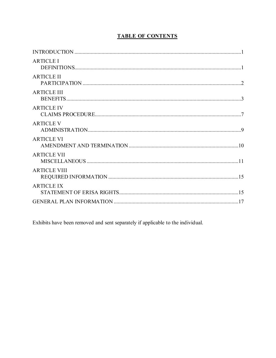 TABLE OF CONTENTS INTRODUCTION ...........................................................................................................................1 ARTICLE I DEFINITIONS...........................................................................................................................1 ARTICLE II PARTICIPATION .....................................................................................................................2 ARTICLE III BENEFITS .................................................................................................................................3 ARTICLE IV CLAIMS PROCEDURE............................................................................................................7 ARTICLE V ADMINISTRATION .................................................................................................................9 ARTICLE VI AMENDMENT AND TERMINATION .................................................................................10 ARTICLE VII MISCELLANEOUS ................................................................................................................11 ARTICLE VIII REQUIRED INFORMATION ................................................................................................15 ARTICLE IX STATEMENT OF ERISA RIGHTS........................................................................................15 GENERAL PLAN INFORMATION ............................................................................................17 Exhibits have been removed and sent separately if applicable to the individual.