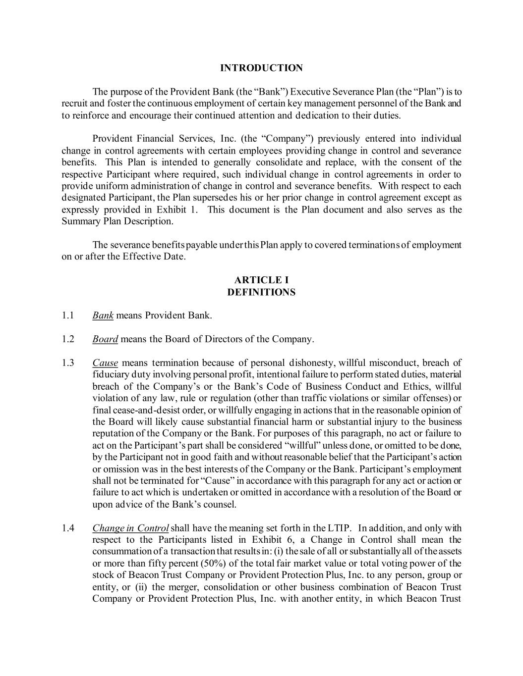 INTRODUCTION The purpose of the Provident Bank (the “Bank”) Executive Severance Plan (the “Plan”) is to recruit and foster the continuous employment of certain key management personnel of the Bank and to reinforce and encourage their continued attention and dedication to their duties. Provident Financial Services, Inc. (the “Company”) previously entered into individual change in control agreements with certain employees providing change in control and severance benefits. This Plan is intended to generally consolidate and replace, with the consent of the respective Participant where required, such individual change in control agreements in order to provide uniform administration of change in control and severance benefits. With respect to each designated Participant, the Plan supersedes his or her prior change in control agreement except as expressly provided in Exhibit 1. This document is the Plan document and also serves as the Summary Plan Description. The severance benefits payable under this Plan apply to covered terminations of employment on or after the Effective Date. ARTICLE I DEFINITIONS 1.1 Bank means Provident Bank. 1.2 Board means the Board of Directors of the Company. 1.3 Cause means termination because of personal dishonesty, willful misconduct, breach of fiduciary duty involving personal profit, intentional failure to perform stated duties, material breach of the Company’s or the Bank’s Code of Business Conduct and Ethics, willful violation of any law, rule or regulation (other than traffic violations or similar offenses) or final cease-and-desist order, or willfully engaging in actions that in the reasonable opinion of the Board will likely cause substantial financial harm or substantial injury to the business reputation of the Company or the Bank. For purposes of this paragraph, no act or failure to act on the Participant’s part shall be considered “willful” unless done, or omitted to be done, by the Participant not in good faith and without reasonable belief that the Participant’s action or omission was in the best interests of the Company or the Bank. Participant’s employment shall not be terminated for “Cause” in accordance with this paragraph for any act or action or failure to act which is undertaken or omitted in accordance with a resolution of the Board or upon advice of the Bank’s counsel. 1.4 Change in Control shall have the meaning set forth in the LTIP. In addition, and only with respect to the Participants listed in Exhibit 6, a Change in Control shall mean the consummation of a transaction that results in: (i) the sale of all or substantially all of the assets or more than fifty percent (50%) of the total fair market value or total voting power of the stock of Beacon Trust Company or Provident Protection Plus, Inc. to any person, group or entity, or (ii) the merger, consolidation or other business combination of Beacon Trust Company or Provident Protection Plus, Inc. with another entity, in which Beacon Trust