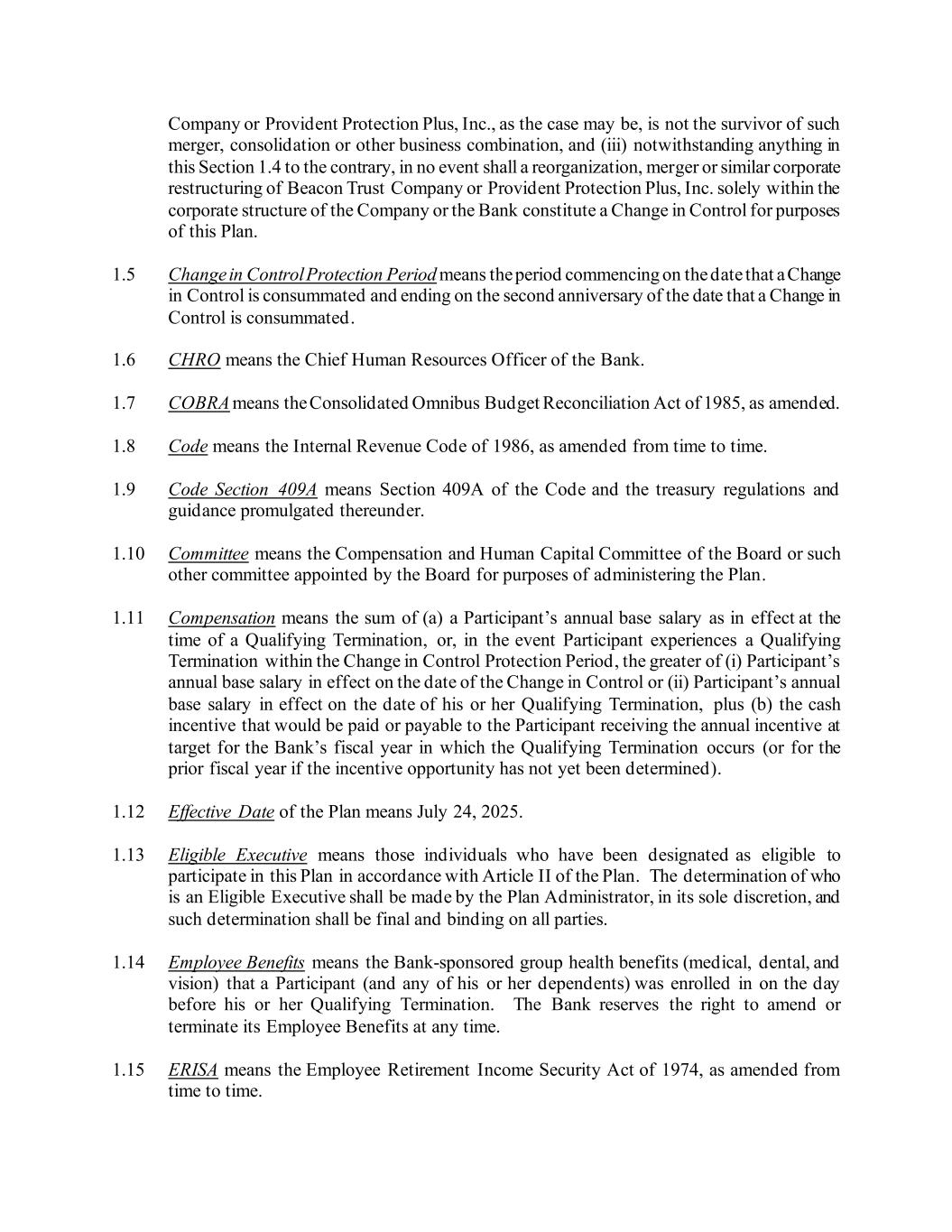 Company or Provident Protection Plus, Inc., as the case may be, is not the survivor of such merger, consolidation or other business combination, and (iii) notwithstanding anything in this Section 1.4 to the contrary, in no event shall a reorganization, merger or similar corporate restructuring of Beacon Trust Company or Provident Protection Plus, Inc. solely within the corporate structure of the Company or the Bank constitute a Change in Control for purposes of this Plan. 1.5 Change in Control Protection Period means the period commencing on the date that a Change in Control is consummated and ending on the second anniversary of the date that a Change in Control is consummated. 1.6 CHRO means the Chief Human Resources Officer of the Bank. 1.7 COBRA means the Consolidated Omnibus Budget Reconciliation Act of 1985, as amended. 1.8 Code means the Internal Revenue Code of 1986, as amended from time to time. 1.9 Code Section 409A means Section 409A of the Code and the treasury regulations and guidance promulgated thereunder. 1.10 Committee means the Compensation and Human Capital Committee of the Board or such other committee appointed by the Board for purposes of administering the Plan. 1.11 Compensation means the sum of (a) a Participant’s annual base salary as in effect at the time of a Qualifying Termination, or, in the event Participant experiences a Qualifying Termination within the Change in Control Protection Period, the greater of (i) Participant’s annual base salary in effect on the date of the Change in Control or (ii) Participant’s annual base salary in effect on the date of his or her Qualifying Termination, plus (b) the cash incentive that would be paid or payable to the Participant receiving the annual incentive at target for the Bank’s fiscal year in which the Qualifying Termination occurs (or for the prior fiscal year if the incentive opportunity has not yet been determined). 1.12 Effective Date of the Plan means July 24, 2025. 1.13 Eligible Executive means those individuals who have been designated as eligible to participate in this Plan in accordance with Article II of the Plan. The determination of who is an Eligible Executive shall be made by the Plan Administrator, in its sole discretion, and such determination shall be final and binding on all parties. 1.14 Employee Benefits means the Bank-sponsored group health benefits (medical, dental, and vision) that a Participant (and any of his or her dependents) was enrolled in on the day before his or her Qualifying Termination. The Bank reserves the right to amend or terminate its Employee Benefits at any time. 1.15 ERISA means the Employee Retirement Income Security Act of 1974, as amended from time to time.