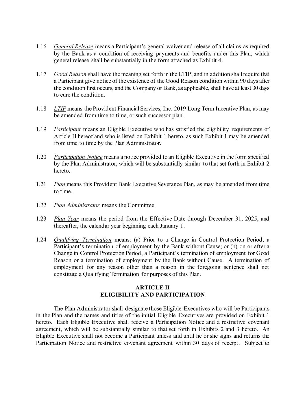 1.16 General Release means a Participant’s general waiver and release of all claims as required by the Bank as a condition of receiving payments and benefits under this Plan, which general release shall be substantially in the form attached as Exhibit 4. 1.17 Good Reason shall have the meaning set forth in the LTIP, and in addition shall require that a Participant give notice of the existence of the Good Reason condition within 90 days after the condition first occurs, and the Company or Bank, as applicable, shall have at least 30 days to cure the condition. 1.18 LTIP means the Provident Financial Services, Inc. 2019 Long Term Incentive Plan, as may be amended from time to time, or such successor plan. 1.19 Participant means an Eligible Executive who has satisfied the eligibility requirements of Article II hereof and who is listed on Exhibit 1 hereto, as such Exhibit 1 may be amended from time to time by the Plan Administrator. 1.20 Participation Notice means a notice provided to an Eligible Executive in the form specified by the Plan Administrator, which will be substantially similar to that set forth in Exhibit 2 hereto. 1.21 Plan means this Provident Bank Executive Severance Plan, as may be amended from time to time. 1.22 Plan Administrator means the Committee. 1.23 Plan Year means the period from the Effective Date through December 31, 2025, and thereafter, the calendar year beginning each January 1. 1.24 Qualifying Termination means: (a) Prior to a Change in Control Protection Period, a Participant’s termination of employment by the Bank without Cause; or (b) on or after a Change in Control Protection Period, a Participant’s termination of employment for Good Reason or a termination of employment by the Bank without Cause. A termination of employment for any reason other than a reason in the foregoing sentence shall not constitute a Qualifying Termination for purposes of this Plan. ARTICLE II ELIGIBILITY AND PARTICIPATION The Plan Administrator shall designate those Eligible Executives who will be Participants in the Plan and the names and titles of the initial Eligible Executives are provided on Exhibit 1 hereto. Each Eligible Executive shall receive a Participation Notice and a restrictive covenant agreement, which will be substantially similar to that set forth in Exhibits 2 and 3 hereto. An Eligible Executive shall not become a Participant unless and until he or she signs and returns the Participation Notice and restrictive covenant agreement within 30 days of receipt. Subject to