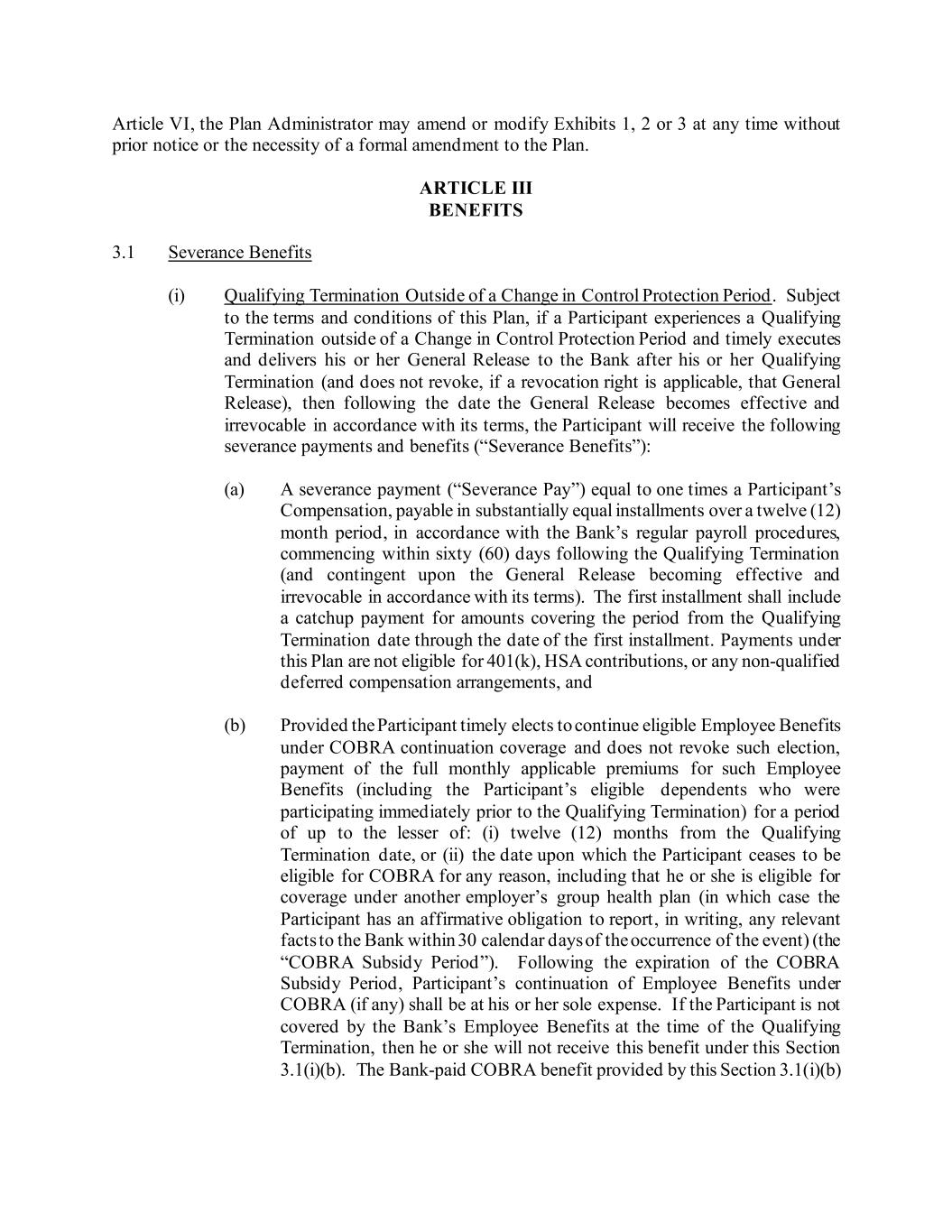 Article VI, the Plan Administrator may amend or modify Exhibits 1, 2 or 3 at any time without prior notice or the necessity of a formal amendment to the Plan. ARTICLE III BENEFITS 3.1 Severance Benefits (i) Qualifying Termination Outside of a Change in Control Protection Period. Subject to the terms and conditions of this Plan, if a Participant experiences a Qualifying Termination outside of a Change in Control Protection Period and timely executes and delivers his or her General Release to the Bank after his or her Qualifying Termination (and does not revoke, if a revocation right is applicable, that General Release), then following the date the General Release becomes effective and irrevocable in accordance with its terms, the Participant will receive the following severance payments and benefits (“Severance Benefits”): (a) A severance payment (“Severance Pay”) equal to one times a Participant’s Compensation, payable in substantially equal installments over a twelve (12) month period, in accordance with the Bank’s regular payroll procedures, commencing within sixty (60) days following the Qualifying Termination (and contingent upon the General Release becoming effective and irrevocable in accordance with its terms). The first installment shall include a catchup payment for amounts covering the period from the Qualifying Termination date through the date of the first installment. Payments under this Plan are not eligible for 401(k), HSA contributions, or any non-qualified deferred compensation arrangements, and (b) Provided the Participant timely elects to continue eligible Employee Benefits under COBRA continuation coverage and does not revoke such election, payment of the full monthly applicable premiums for such Employee Benefits (including the Participant’s eligible dependents who were participating immediately prior to the Qualifying Termination) for a period of up to the lesser of: (i) twelve (12) months from the Qualifying Termination date, or (ii) the date upon which the Participant ceases to be eligible for COBRA for any reason, including that he or she is eligible for coverage under another employer’s group health plan (in which case the Participant has an affirmative obligation to report, in writing, any relevant facts to the Bank within 30 calendar days of the occurrence of the event) (the “COBRA Subsidy Period”). Following the expiration of the COBRA Subsidy Period, Participant’s continuation of Employee Benefits under COBRA (if any) shall be at his or her sole expense. If the Participant is not covered by the Bank’s Employee Benefits at the time of the Qualifying Termination, then he or she will not receive this benefit under this Section 3.1(i)(b). The Bank-paid COBRA benefit provided by this Section 3.1(i)(b)
