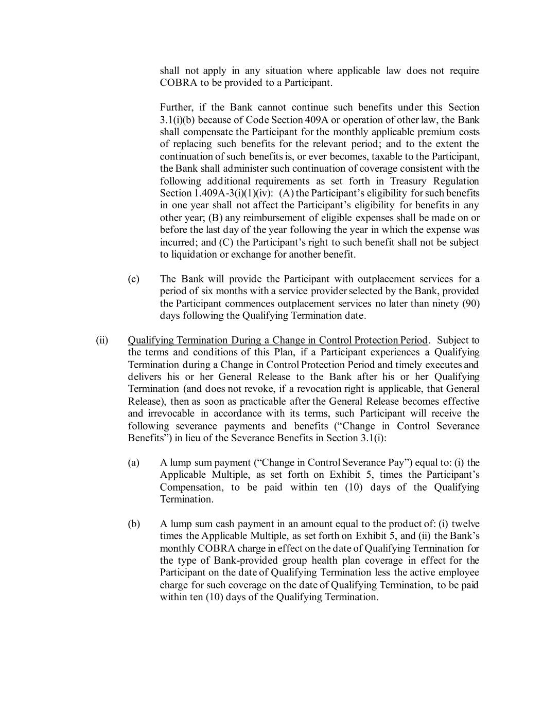 shall not apply in any situation where applicable law does not require COBRA to be provided to a Participant. Further, if the Bank cannot continue such benefits under this Section 3.1(i)(b) because of Code Section 409A or operation of other law, the Bank shall compensate the Participant for the monthly applicable premium costs of replacing such benefits for the relevant period; and to the extent the continuation of such benefits is, or ever becomes, taxable to the Participant, the Bank shall administer such continuation of coverage consistent with the following additional requirements as set forth in Treasury Regulation Section 1.409A-3(i)(1)(iv): (A) the Participant’s eligibility for such benefits in one year shall not affect the Participant’s eligibility for benefits in any other year; (B) any reimbursement of eligible expenses shall be made on or before the last day of the year following the year in which the expense was incurred; and (C) the Participant’s right to such benefit shall not be subject to liquidation or exchange for another benefit. (c) The Bank will provide the Participant with outplacement services for a period of six months with a service provider selected by the Bank, provided the Participant commences outplacement services no later than ninety (90) days following the Qualifying Termination date. (ii) Qualifying Termination During a Change in Control Protection Period. Subject to the terms and conditions of this Plan, if a Participant experiences a Qualifying Termination during a Change in Control Protection Period and timely executes and delivers his or her General Release to the Bank after his or her Qualifying Termination (and does not revoke, if a revocation right is applicable, that General Release), then as soon as practicable after the General Release becomes effective and irrevocable in accordance with its terms, such Participant will receive the following severance payments and benefits (“Change in Control Severance Benefits”) in lieu of the Severance Benefits in Section 3.1(i): (a) A lump sum payment (“Change in Control Severance Pay”) equal to: (i) the Applicable Multiple, as set forth on Exhibit 5, times the Participant’s Compensation, to be paid within ten (10) days of the Qualifying Termination. (b) A lump sum cash payment in an amount equal to the product of: (i) twelve times the Applicable Multiple, as set forth on Exhibit 5, and (ii) the Bank’s monthly COBRA charge in effect on the date of Qualifying Termination for the type of Bank-provided group health plan coverage in effect for the Participant on the date of Qualifying Termination less the active employee charge for such coverage on the date of Qualifying Termination, to be paid within ten (10) days of the Qualifying Termination.