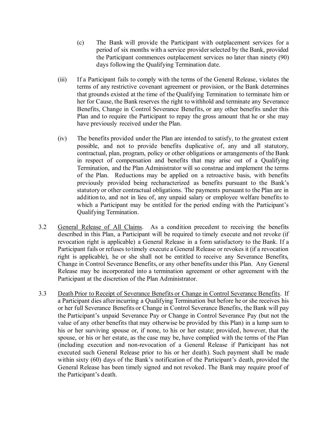 (c) The Bank will provide the Participant with outplacement services for a period of six months with a service provider selected by the Bank, provided the Participant commences outplacement services no later than ninety (90) days following the Qualifying Termination date. (iii) If a Participant fails to comply with the terms of the General Release, violates the terms of any restrictive covenant agreement or provision, or the Bank determines that grounds existed at the time of the Qualifying Termination to terminate him or her for Cause, the Bank reserves the right to withhold and terminate any Severance Benefits, Change in Control Severance Benefits, or any other benefits under this Plan and to require the Participant to repay the gross amount that he or she may have previously received under the Plan. (iv) The benefits provided under the Plan are intended to satisfy, to the greatest extent possible, and not to provide benefits duplicative of, any and all statutory, contractual, plan, program, policy or other obligations or arrangements of the Bank in respect of compensation and benefits that may arise out of a Qualifying Termination, and the Plan Administrator will so construe and implement the terms of the Plan. Reductions may be applied on a retroactive basis, with benefits previously provided being recharacterized as benefits pursuant to the Bank’s statutory or other contractual obligations. The payments pursuant to the Plan are in addition to, and not in lieu of, any unpaid salary or employee welfare benefits to which a Participant may be entitled for the period ending with the Participant’s Qualifying Termination. 3.2 General Release of All Claims. As a condition precedent to receiving the benefits described in this Plan, a Participant will be required to timely execute and not revoke (if revocation right is applicable) a General Release in a form satisfactory to the Bank. If a Participant fails or refuses to timely execute a General Release or revokes it (if a revocation right is applicable), he or she shall not be entitled to receive any Severance Benefits, Change in Control Severance Benefits, or any other benefits under this Plan. Any General Release may be incorporated into a termination agreement or other agreement with the Participant at the discretion of the Plan Administrator. 3.3 Death Prior to Receipt of Severance Benefits or Change in Control Severance Benefits. If a Participant dies after incurring a Qualifying Termination but before he or she receives his or her full Severance Benefits or Change in Control Severance Benefits, the Bank will pay the Participant’s unpaid Severance Pay or Change in Control Severance Pay (but not the value of any other benefits that may otherwise be provided by this Plan) in a lump sum to his or her surviving spouse or, if none, to his or her estate; provided, however, that the spouse, or his or her estate, as the case may be, have complied with the terms of the Plan (including execution and non-revocation of a General Release if Participant has not executed such General Release prior to his or her death). Such payment shall be made within sixty (60) days of the Bank’s notification of the Participant’s death, provided the General Release has been timely signed and not revoked. The Bank may require proof of the Participant’s death.