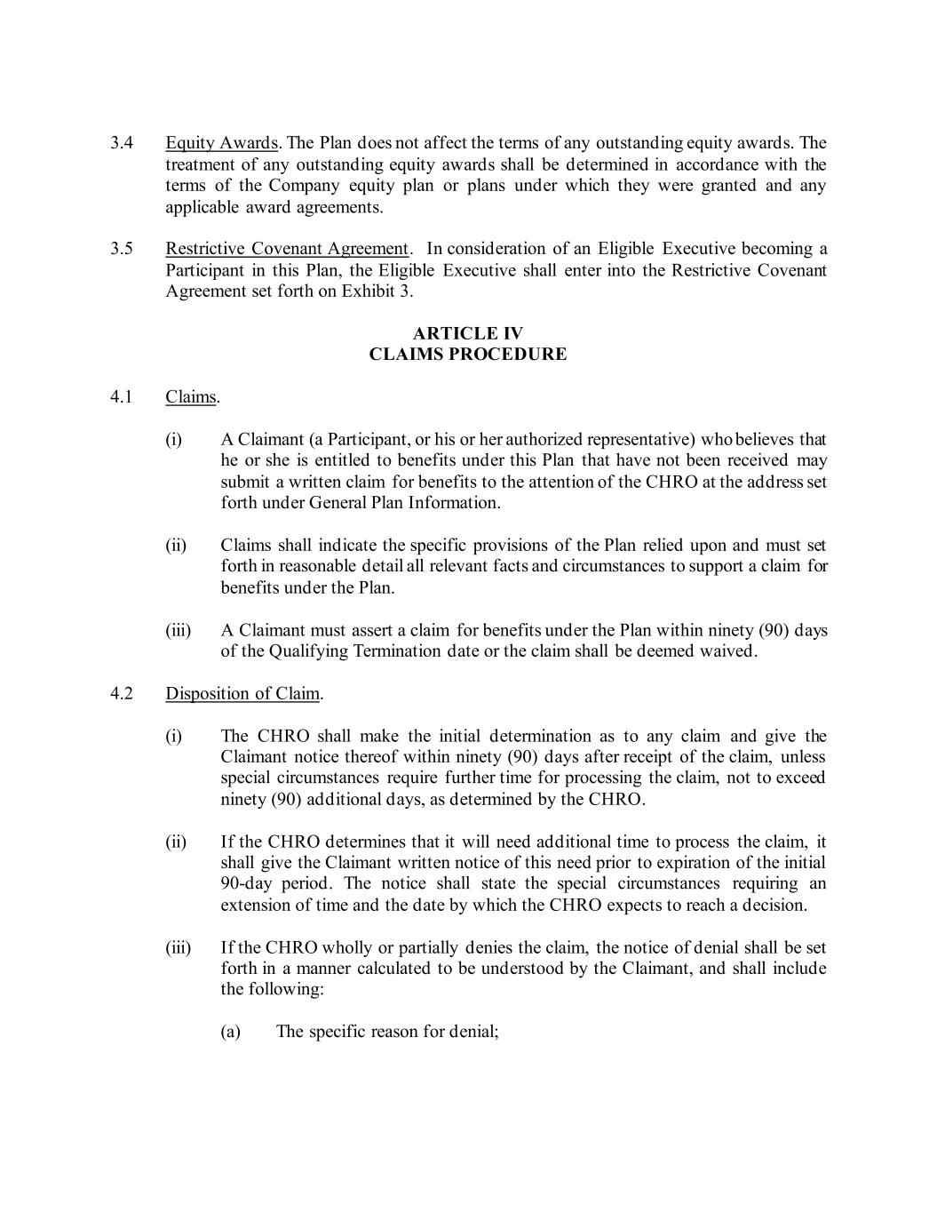 3.4 Equity Awards. The Plan does not affect the terms of any outstanding equity awards. The treatment of any outstanding equity awards shall be determined in accordance with the terms of the Company equity plan or plans under which they were granted and any applicable award agreements. 3.5 Restrictive Covenant Agreement. In consideration of an Eligible Executive becoming a Participant in this Plan, the Eligible Executive shall enter into the Restrictive Covenant Agreement set forth on Exhibit 3. ARTICLE IV CLAIMS PROCEDURE 4.1 Claims. (i) A Claimant (a Participant, or his or her authorized representative) who believes that he or she is entitled to benefits under this Plan that have not been received may submit a written claim for benefits to the attention of the CHRO at the address set forth under General Plan Information. (ii) Claims shall indicate the specific provisions of the Plan relied upon and must set forth in reasonable detail all relevant facts and circumstances to support a claim for benefits under the Plan. (iii) A Claimant must assert a claim for benefits under the Plan within ninety (90) days of the Qualifying Termination date or the claim shall be deemed waived. 4.2 Disposition of Claim. (i) The CHRO shall make the initial determination as to any claim and give the Claimant notice thereof within ninety (90) days after receipt of the claim, unless special circumstances require further time for processing the claim, not to exceed ninety (90) additional days, as determined by the CHRO. (ii) If the CHRO determines that it will need additional time to process the claim, it shall give the Claimant written notice of this need prior to expiration of the initial 90-day period. The notice shall state the special circumstances requiring an extension of time and the date by which the CHRO expects to reach a decision. (iii) If the CHRO wholly or partially denies the claim, the notice of denial shall be set forth in a manner calculated to be understood by the Claimant, and shall include the following: (a) The specific reason for denial;