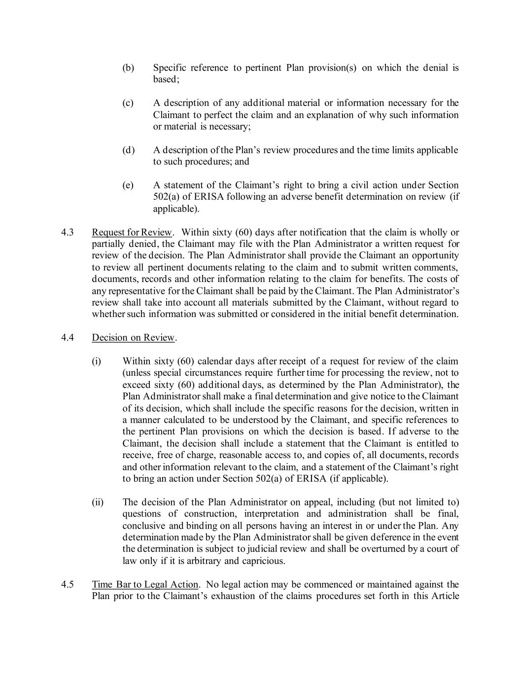 (b) Specific reference to pertinent Plan provision(s) on which the denial is based; (c) A description of any additional material or information necessary for the Claimant to perfect the claim and an explanation of why such information or material is necessary; (d) A description of the Plan’s review procedures and the time limits applicable to such procedures; and (e) A statement of the Claimant’s right to bring a civil action under Section 502(a) of ERISA following an adverse benefit determination on review (if applicable). 4.3 Request for Review. Within sixty (60) days after notification that the claim is wholly or partially denied, the Claimant may file with the Plan Administrator a written request for review of the decision. The Plan Administrator shall provide the Claimant an opportunity to review all pertinent documents relating to the claim and to submit written comments, documents, records and other information relating to the claim for benefits. The costs of any representative for the Claimant shall be paid by the Claimant. The Plan Administrator’s review shall take into account all materials submitted by the Claimant, without regard to whether such information was submitted or considered in the initial benefit determination. 4.4 Decision on Review. (i) Within sixty (60) calendar days after receipt of a request for review of the claim (unless special circumstances require further time for processing the review, not to exceed sixty (60) additional days, as determined by the Plan Administrator), the Plan Administrator shall make a final determination and give notice to the Claimant of its decision, which shall include the specific reasons for the decision, written in a manner calculated to be understood by the Claimant, and specific references to the pertinent Plan provisions on which the decision is based. If adverse to the Claimant, the decision shall include a statement that the Claimant is entitled to receive, free of charge, reasonable access to, and copies of, all documents, records and other information relevant to the claim, and a statement of the Claimant’s right to bring an action under Section 502(a) of ERISA (if applicable). (ii) The decision of the Plan Administrator on appeal, including (but not limited to) questions of construction, interpretation and administration shall be final, conclusive and binding on all persons having an interest in or under the Plan. Any determination made by the Plan Administrator shall be given deference in the event the determination is subject to judicial review and shall be overturned by a court of law only if it is arbitrary and capricious. 4.5 Time Bar to Legal Action. No legal action may be commenced or maintained against the Plan prior to the Claimant’s exhaustion of the claims procedures set forth in this Article
