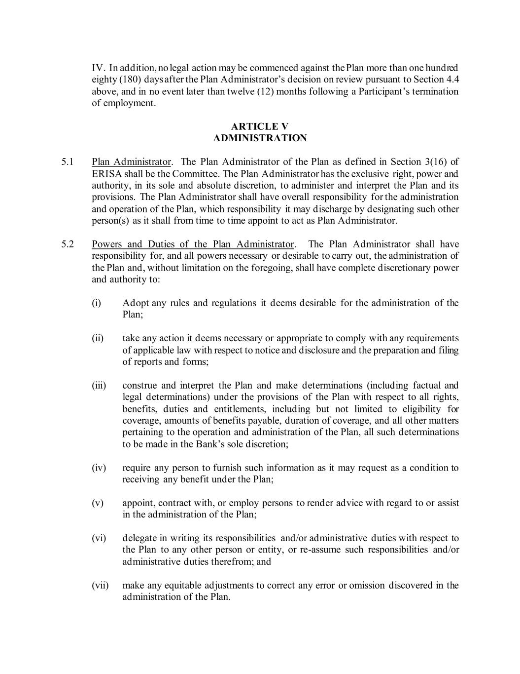 IV. In addition, no legal action may be commenced against the Plan more than one hundred eighty (180) days after the Plan Administrator’s decision on review pursuant to Section 4.4 above, and in no event later than twelve (12) months following a Participant’s termination of employment. ARTICLE V ADMINISTRATION 5.1 Plan Administrator. The Plan Administrator of the Plan as defined in Section 3(16) of ERISA shall be the Committee. The Plan Administrator has the exclusive right, power and authority, in its sole and absolute discretion, to administer and interpret the Plan and its provisions. The Plan Administrator shall have overall responsibility for the administration and operation of the Plan, which responsibility it may discharge by designating such other person(s) as it shall from time to time appoint to act as Plan Administrator. 5.2 Powers and Duties of the Plan Administrator. The Plan Administrator shall have responsibility for, and all powers necessary or desirable to carry out, the administration of the Plan and, without limitation on the foregoing, shall have complete discretionary power and authority to: (i) Adopt any rules and regulations it deems desirable for the administration of the Plan; (ii) take any action it deems necessary or appropriate to comply with any requirements of applicable law with respect to notice and disclosure and the preparation and filing of reports and forms; (iii) construe and interpret the Plan and make determinations (including factual and legal determinations) under the provisions of the Plan with respect to all rights, benefits, duties and entitlements, including but not limited to eligibility for coverage, amounts of benefits payable, duration of coverage, and all other matters pertaining to the operation and administration of the Plan, all such determinations to be made in the Bank’s sole discretion; (iv) require any person to furnish such information as it may request as a condition to receiving any benefit under the Plan; (v) appoint, contract with, or employ persons to render advice with regard to or assist in the administration of the Plan; (vi) delegate in writing its responsibilities and/or administrative duties with respect to the Plan to any other person or entity, or re-assume such responsibilities and/or administrative duties therefrom; and (vii) make any equitable adjustments to correct any error or omission discovered in the administration of the Plan.